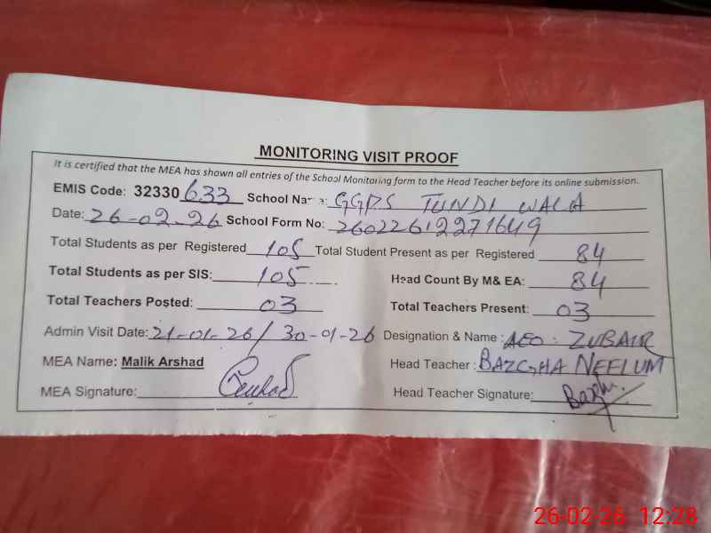 | EMIS Code: 32330633 | Name of School: GGPS TUNDI WALA | |||