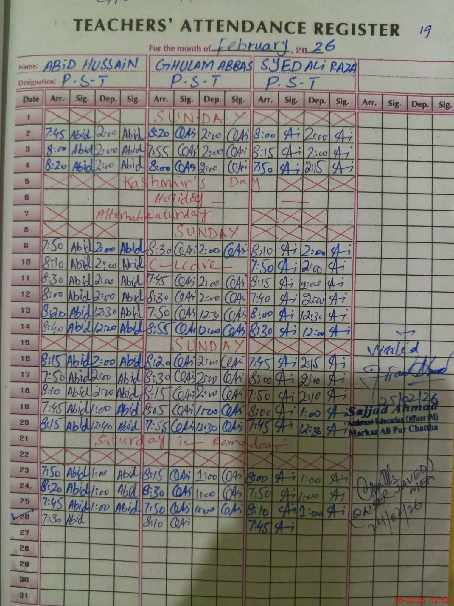 | CNIC | Full Name | Designation | R/C | Absence During Last Calender Month |