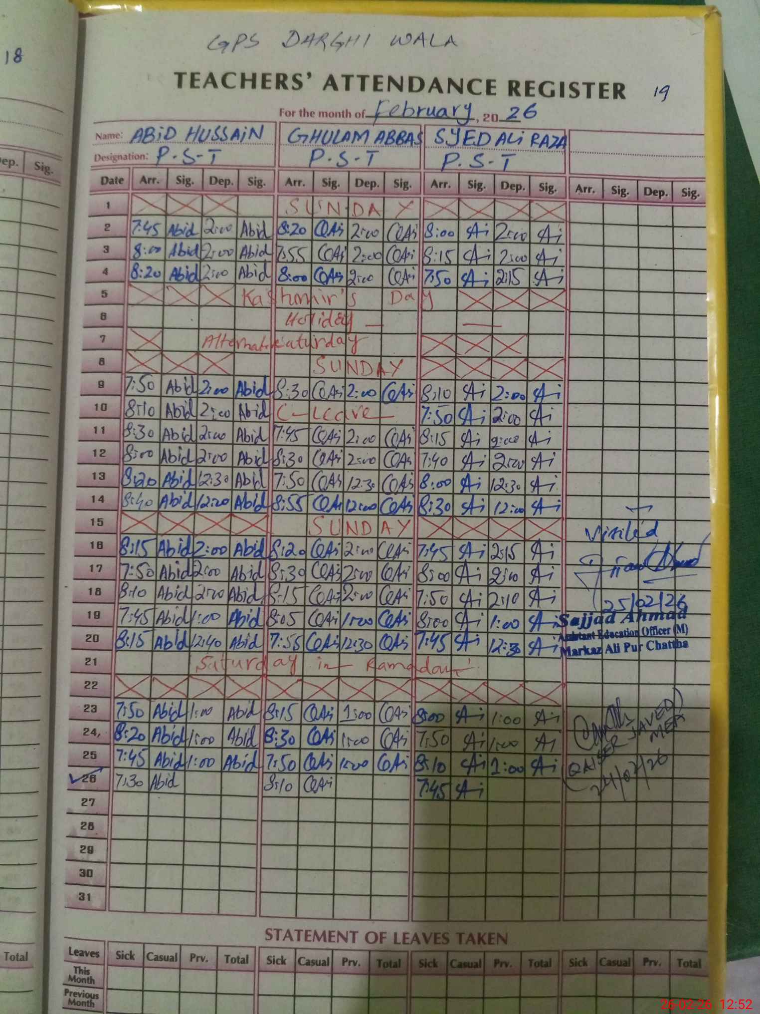 | EMIS Code: 34120235 | Name of School: GPS DURGAHI WALA | |||