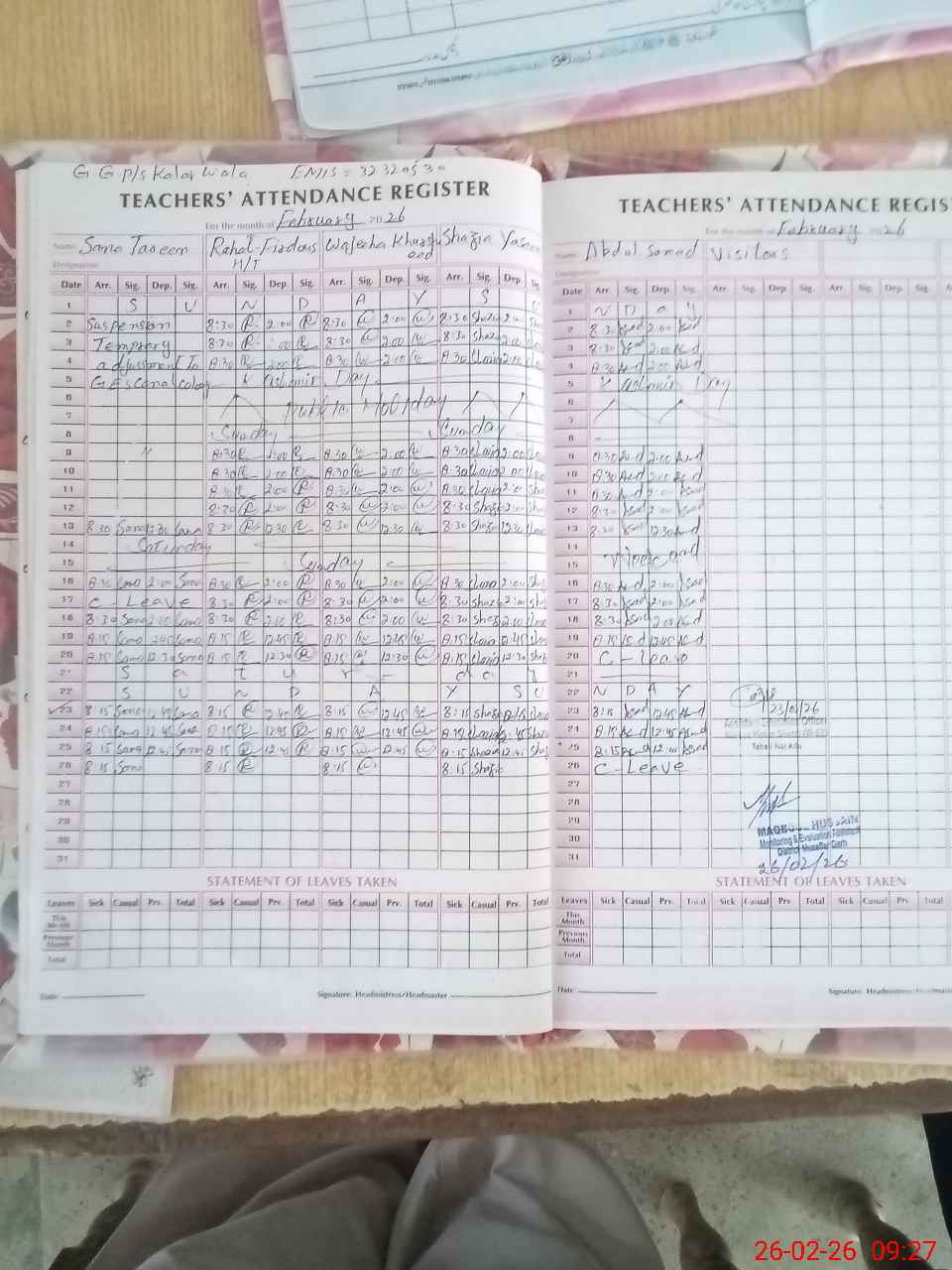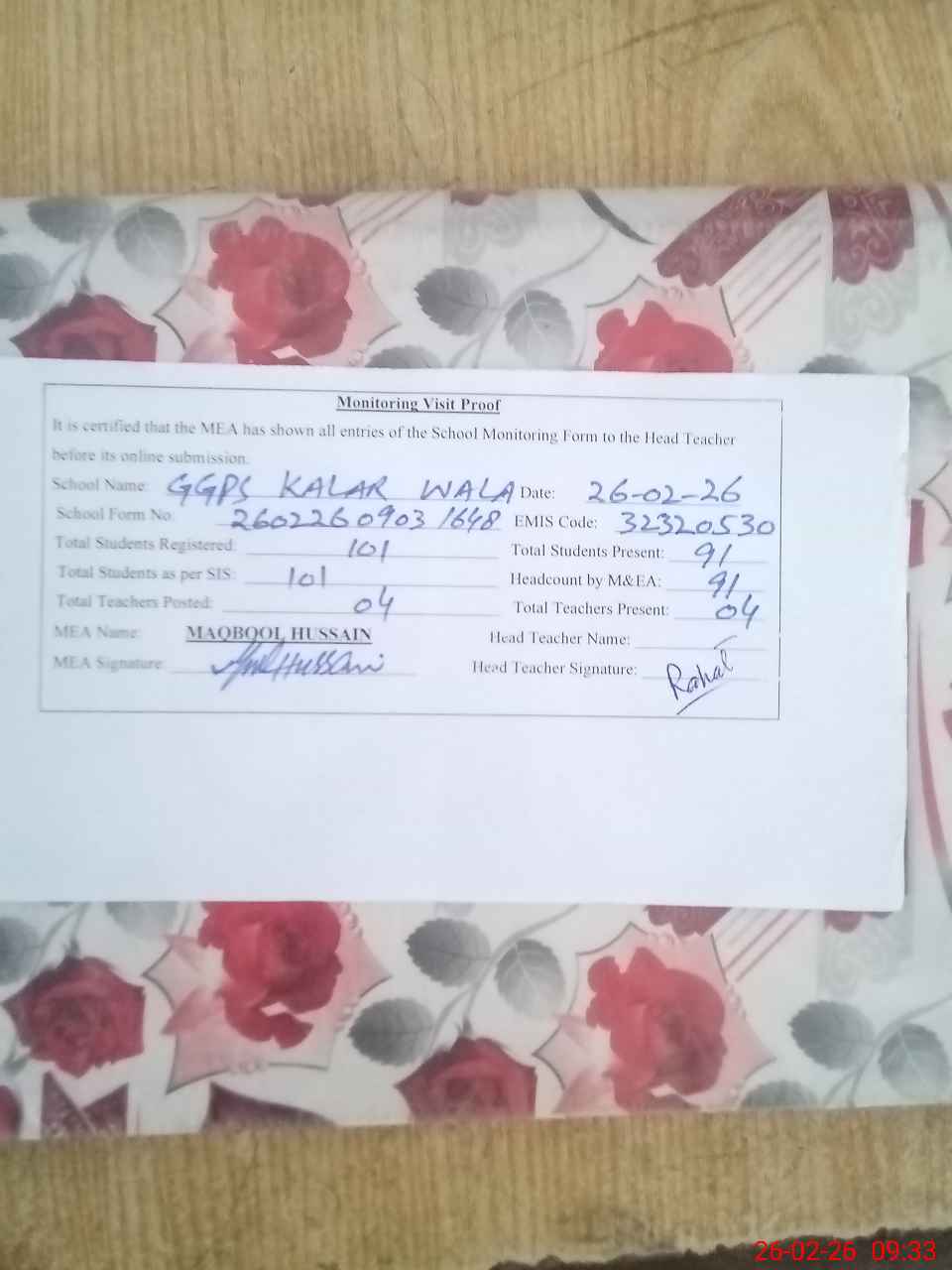 | EMIS Code: 32320530 | Name of School: GGPS KALAR WALA | |||