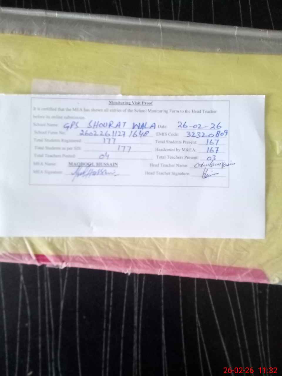 | Attendance Register | Head Teacher | MEA with School | Visit Proof |
