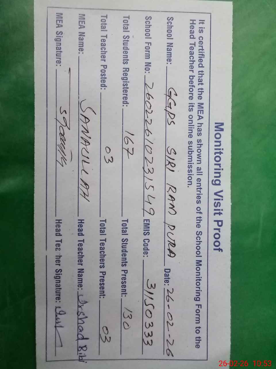 | Monitoring Date: 26-02-2026 | Start Time: 26-02-2026 10:09 AM | End Time: 26-02-2026 10:55 AM | Name of MEA: Sa**** | |