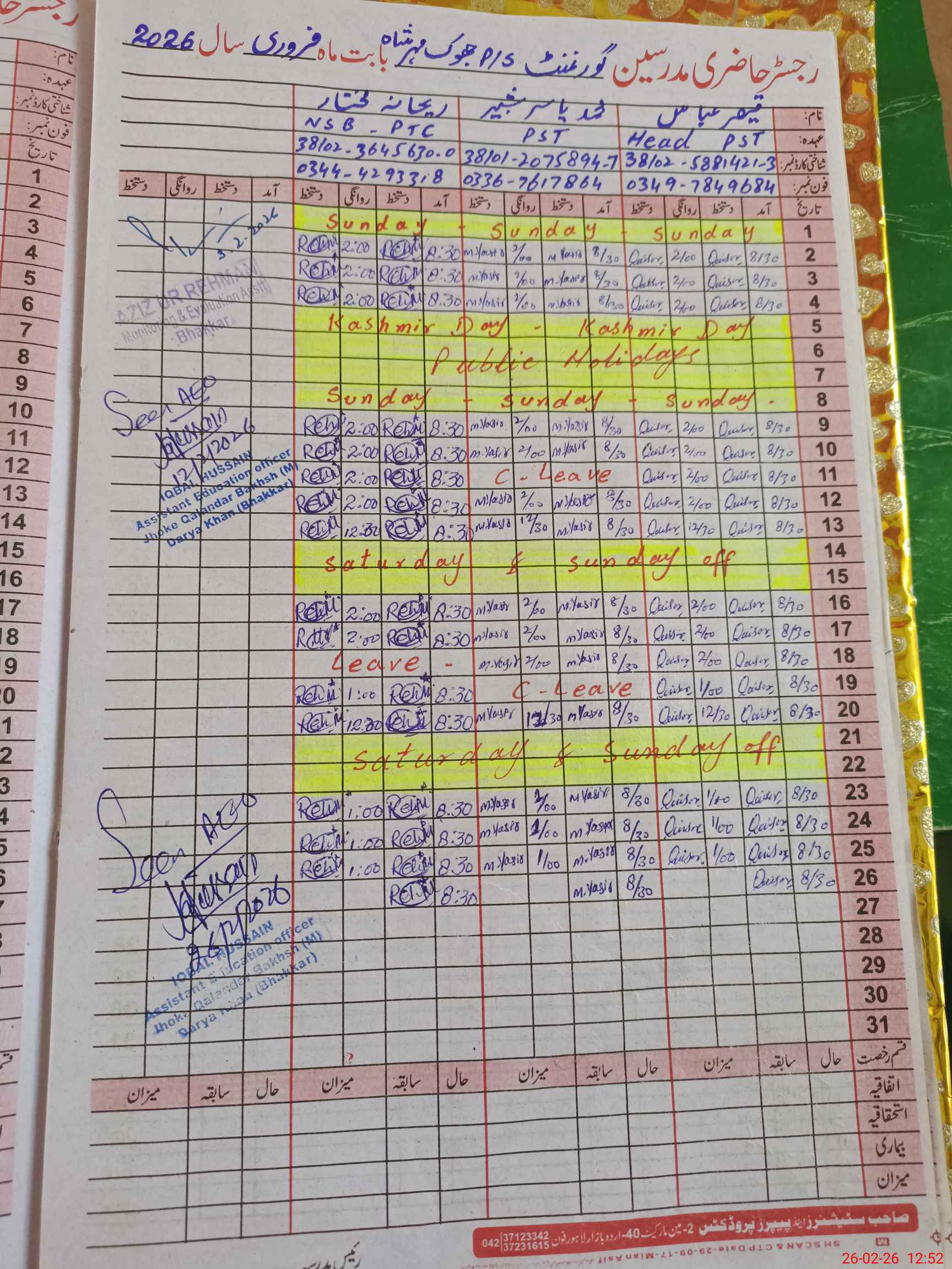 | Name: Qa**** Ab**** Designation: (School Headmaster's/Headmistress's) PST Phone/Cell Number: 03**** |