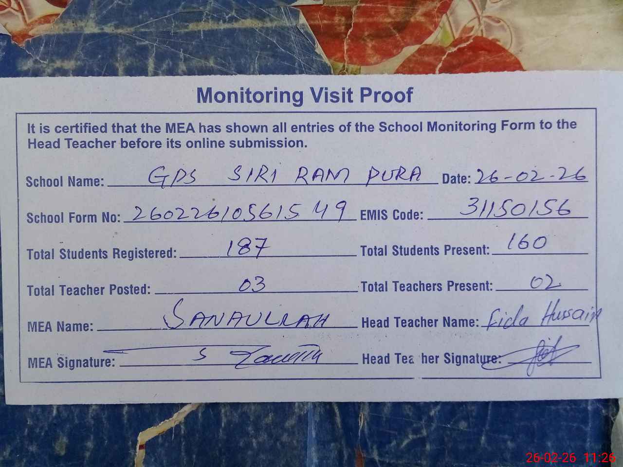 | Monitoring Date: 26-02-2026 | Start Time: 26-02-2026 10:55 AM | End Time: 26-02-2026 11:28 AM | Name of MEA: Sa**** | |