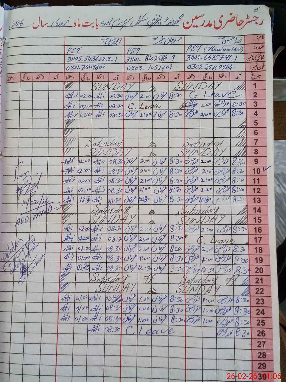 | Name: FI**** HU**** Designation: (School Headmaster's/Headmistress's) PST Phone/Cell Number: 03**** |