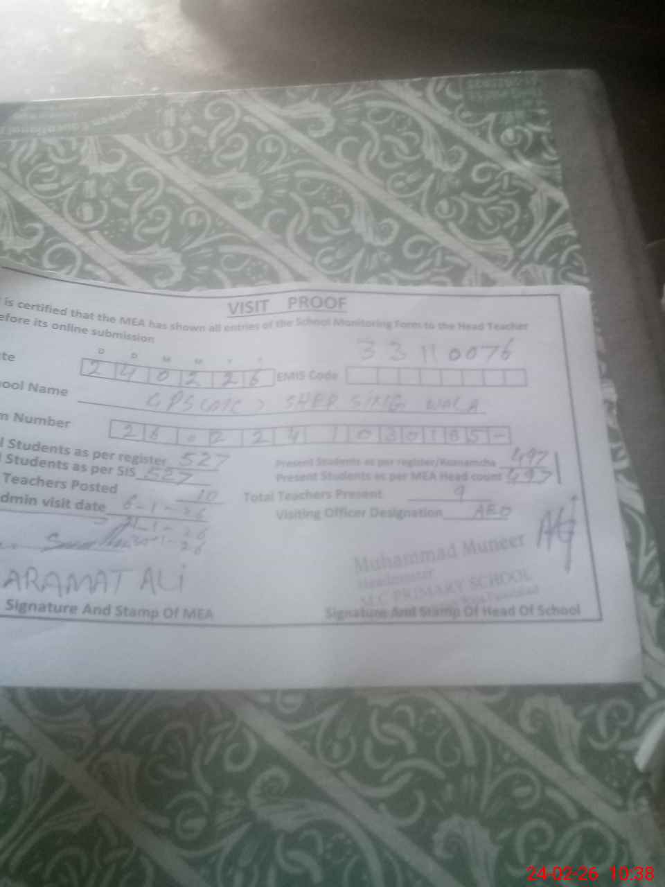 | Attendance Register | Head Teacher | MEA with School | Visit Proof |