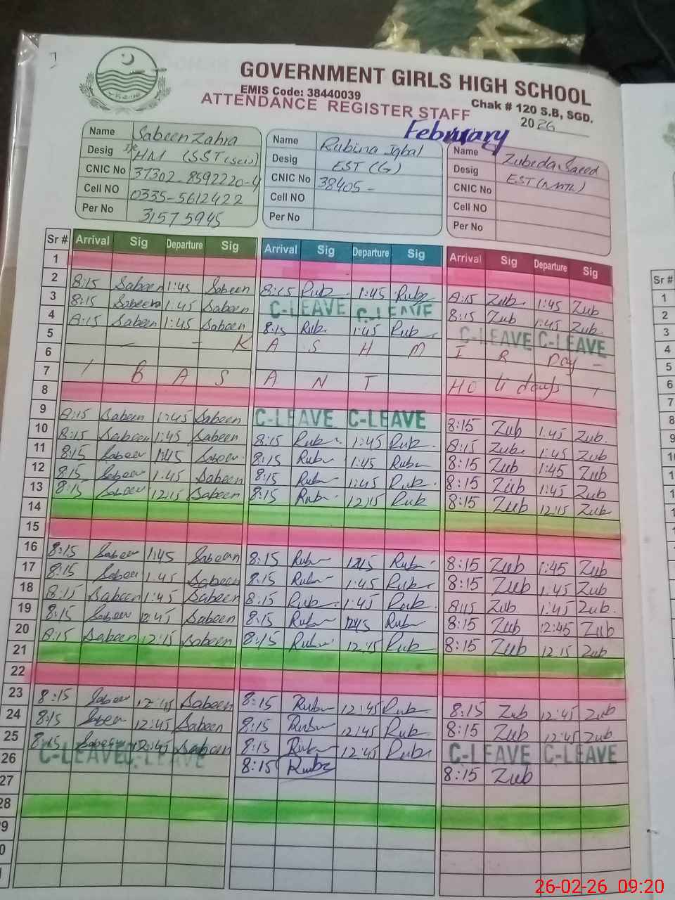 | CNIC | Full Name | Designation | R/C | Absence during last cal. month |