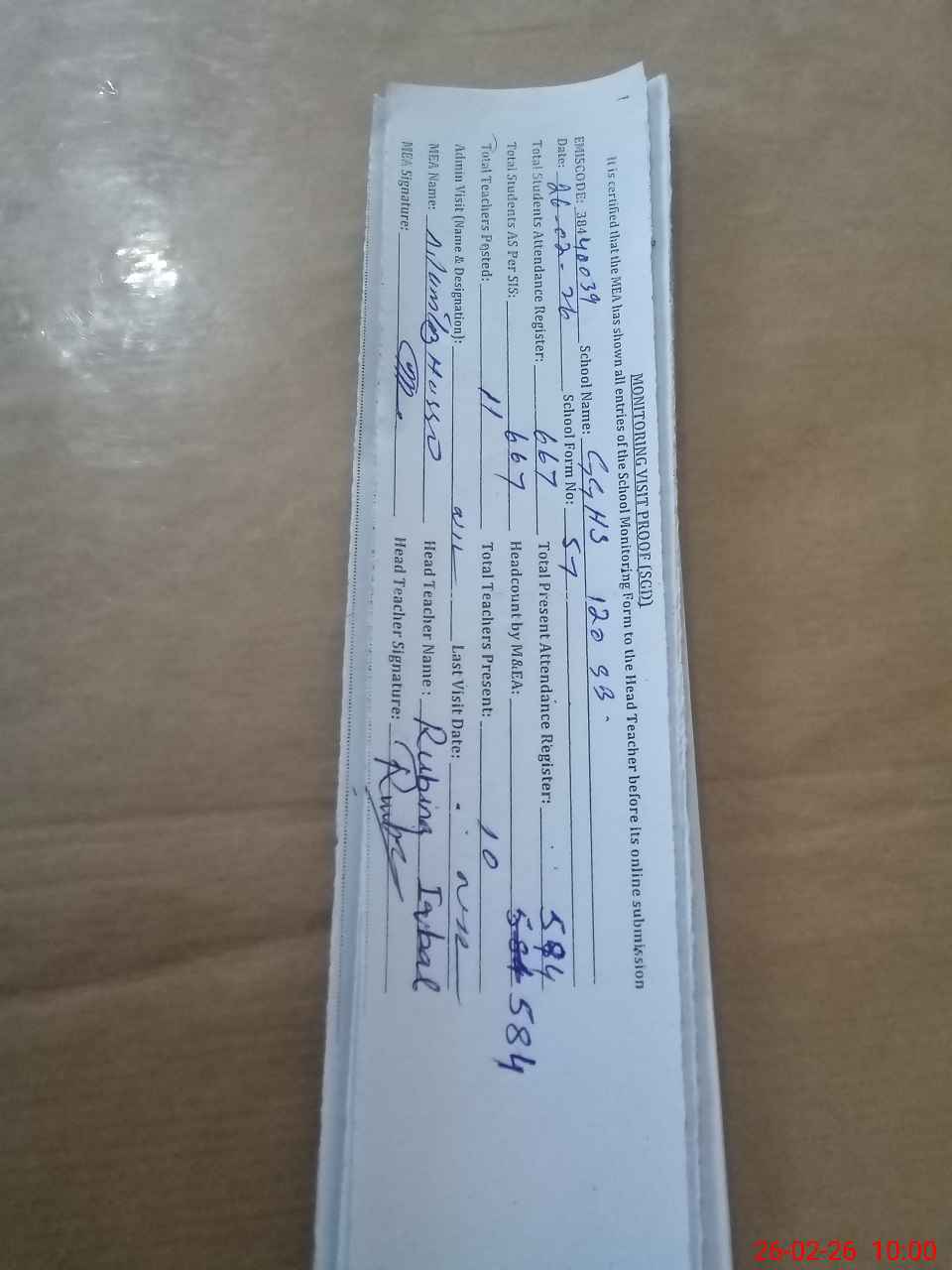 | Attendance Register | Head Teacher | MEA with School | Visit Proof |