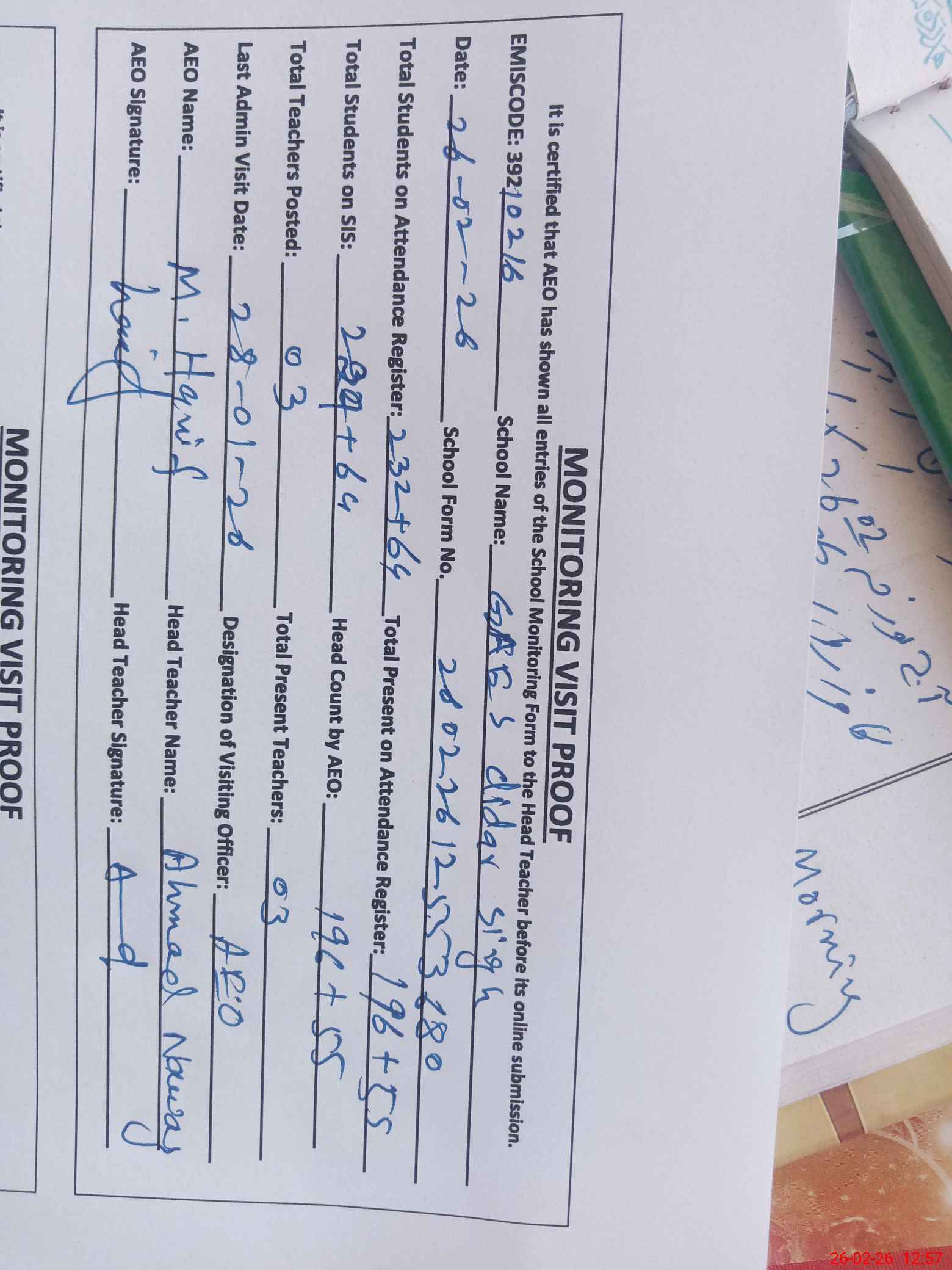 | Certified that this School was Inspected by the Undersigned MEA/DMO Today and the Information Stated Above is as Per Record. | |||||