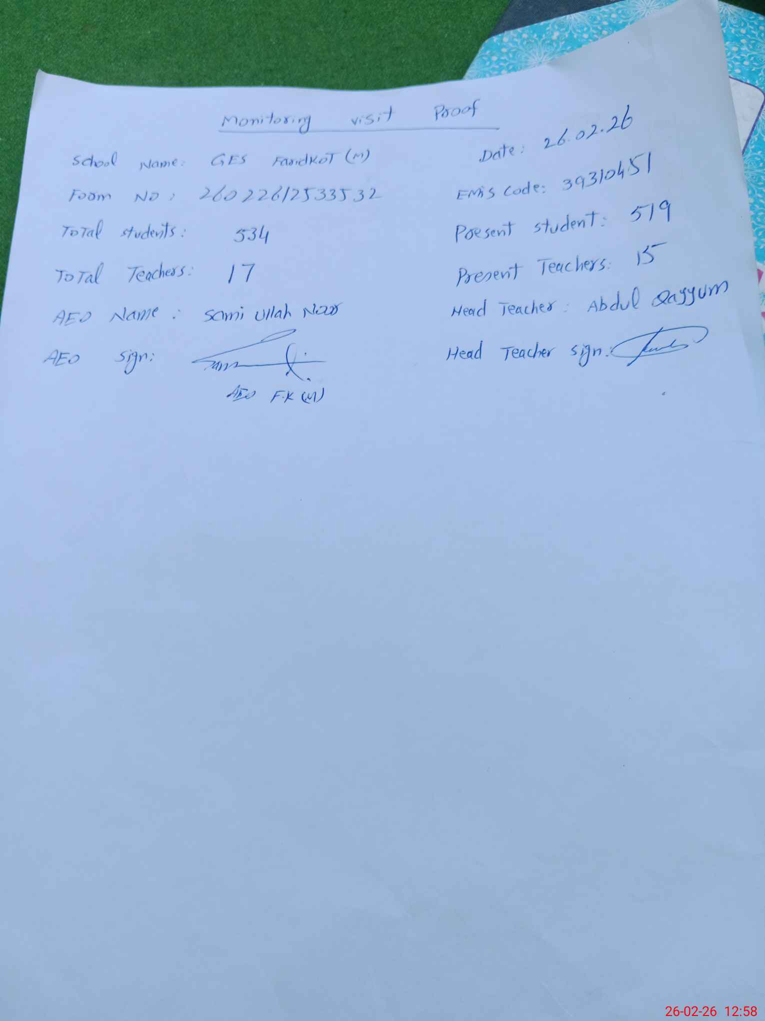 | EMIS Code: 39310451 | Name of School: GES FARID KOT | |||