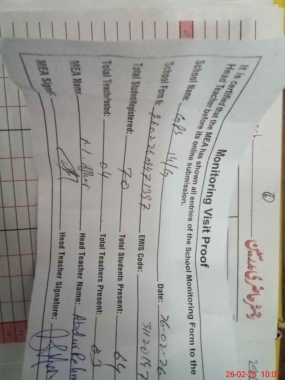 | EMIS Code: 31120147 | Name of School: GPS CHAK 14 GAJIANI | |||