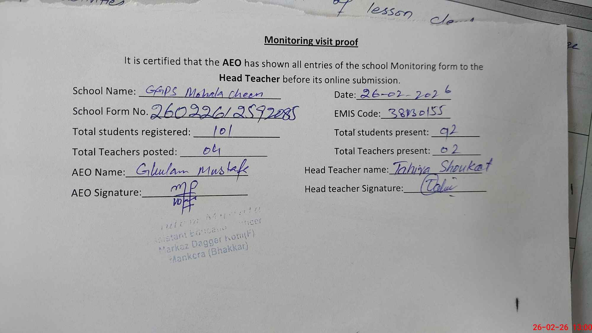 | Monitoring Date: 26-02-2026 | Start Time: 26-02-2026 12:46 PM | End Time: 26-02-2026 01:00 PM | Name of MEA: Gh**** Mu**** | |
