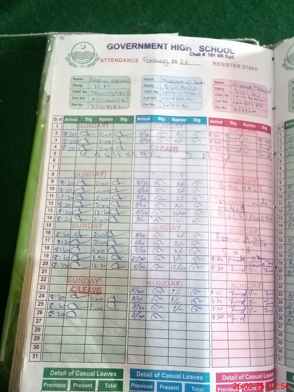 | CNIC | Full Name | Designation | R/C | Absence during last cal. month |