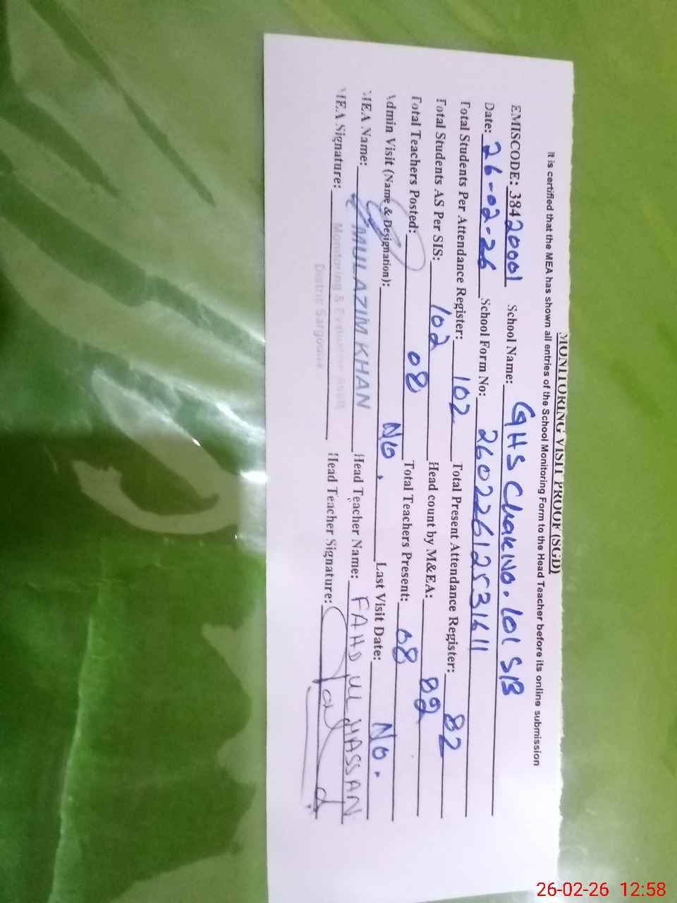 | Attendance Register | Head Teacher | MEA with School | Visit Proof |