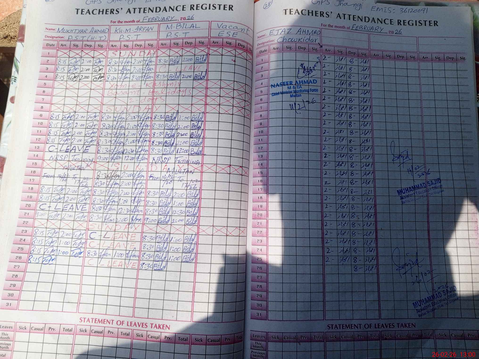 | Attendance Register | Head Teacher | MEA with School | Visit Proof |