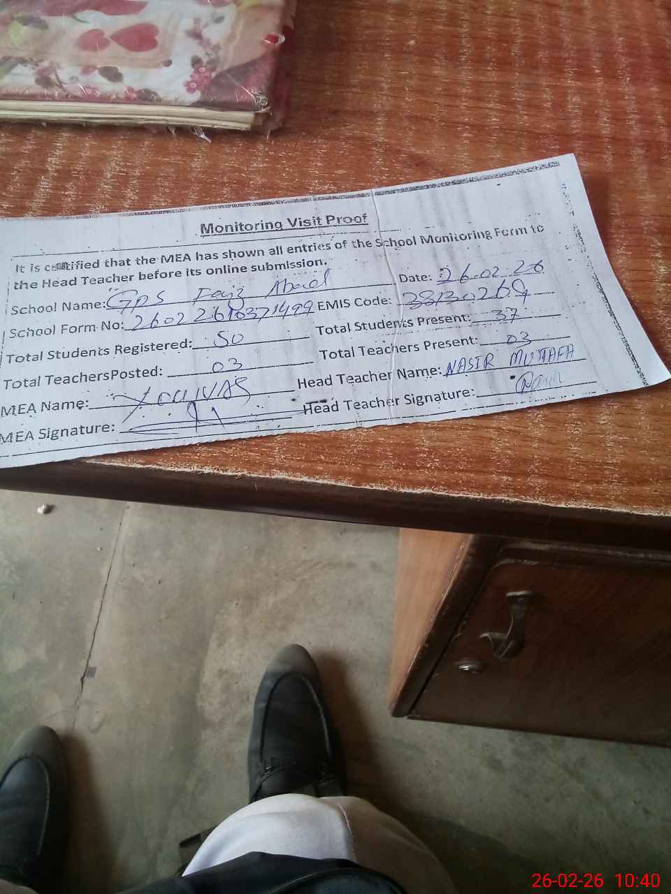 | Attendance Register | Head Teacher | MEA with School | Visit Proof |