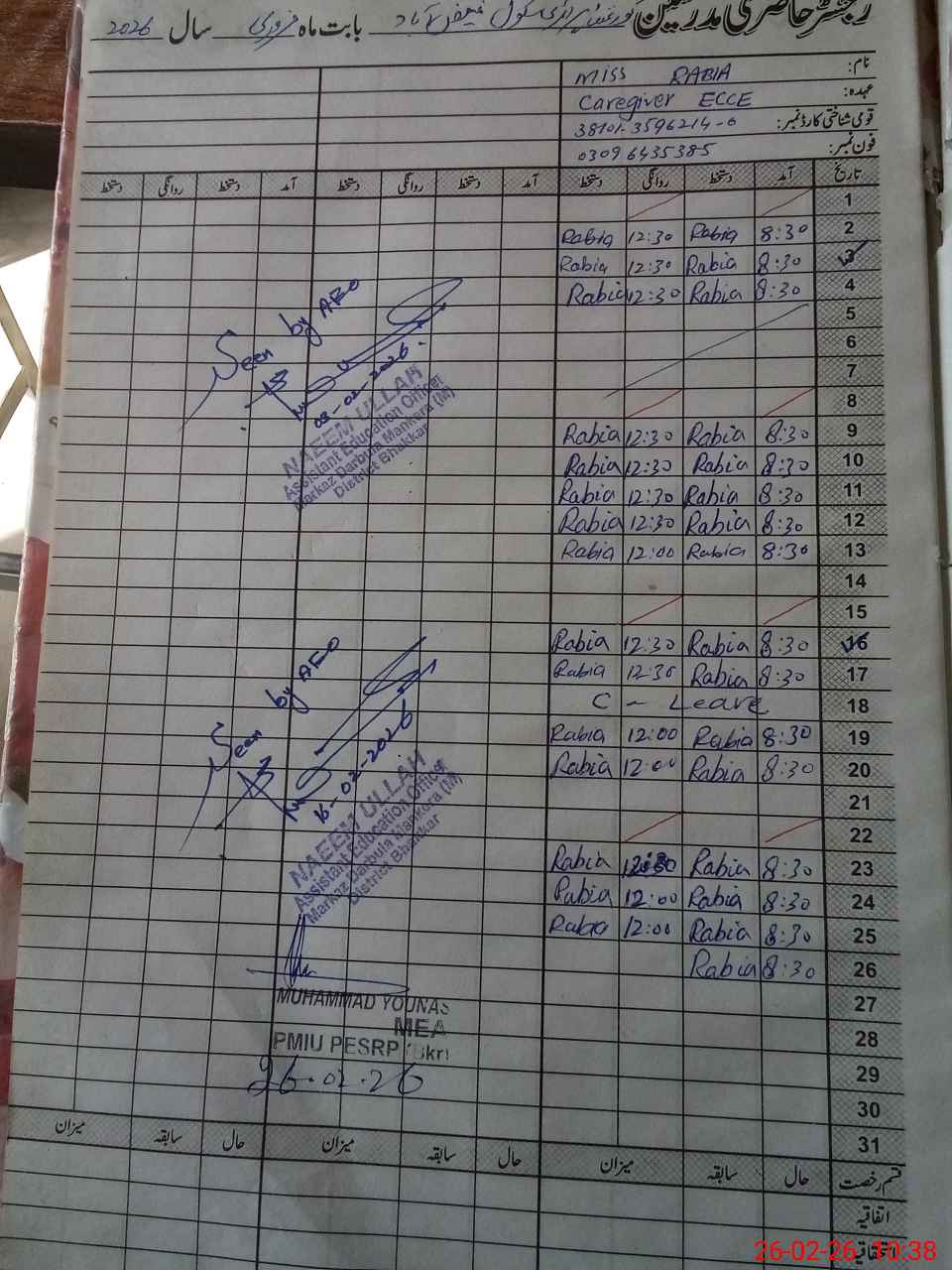 | CNIC | Full Name | Designation | R/C | Absence During Last Calender Month |
