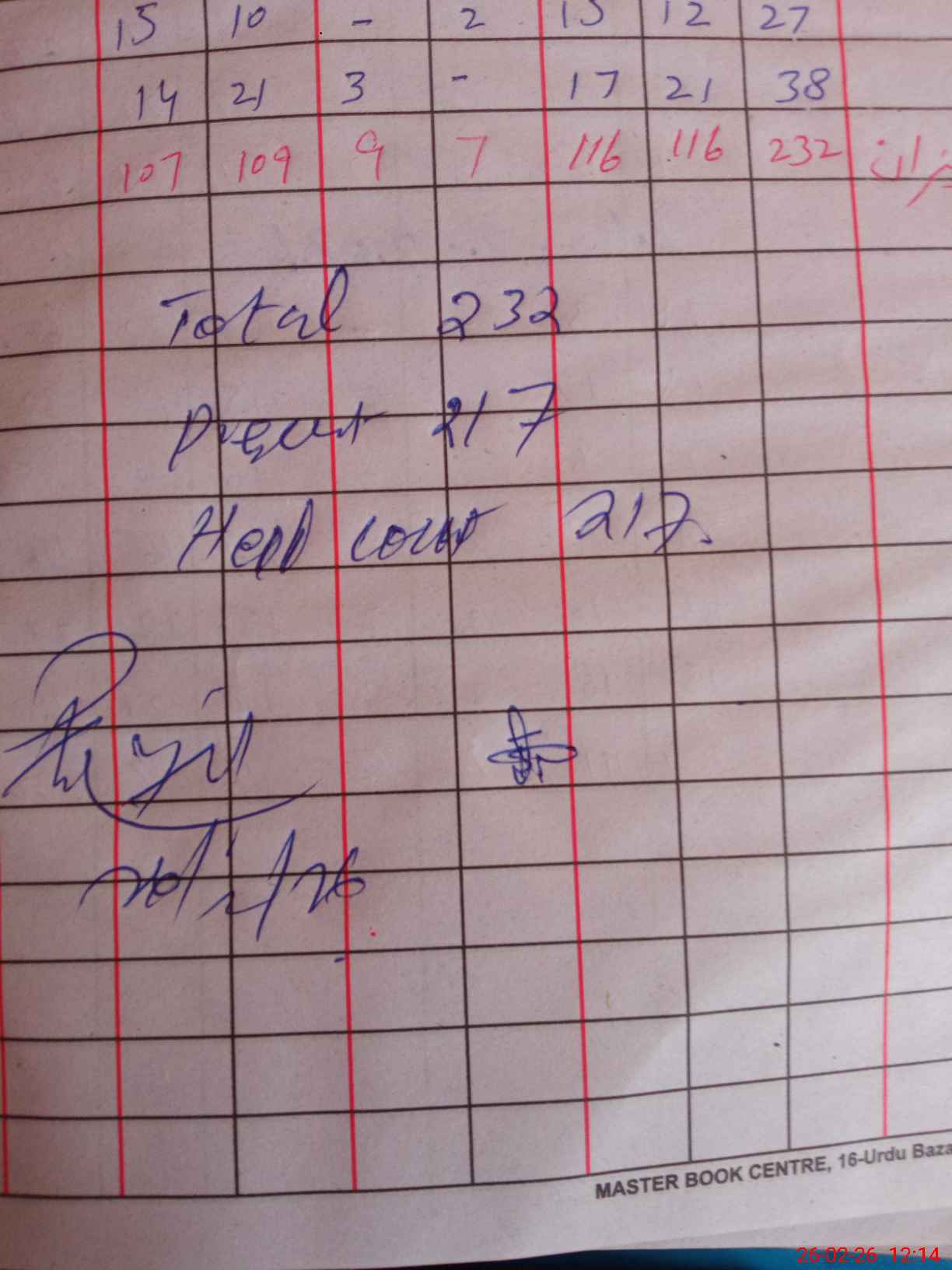 | Total Students Present | 0 | 0 | 29 | 31 | 37 | 25 | 35 | 217 | ||||||||