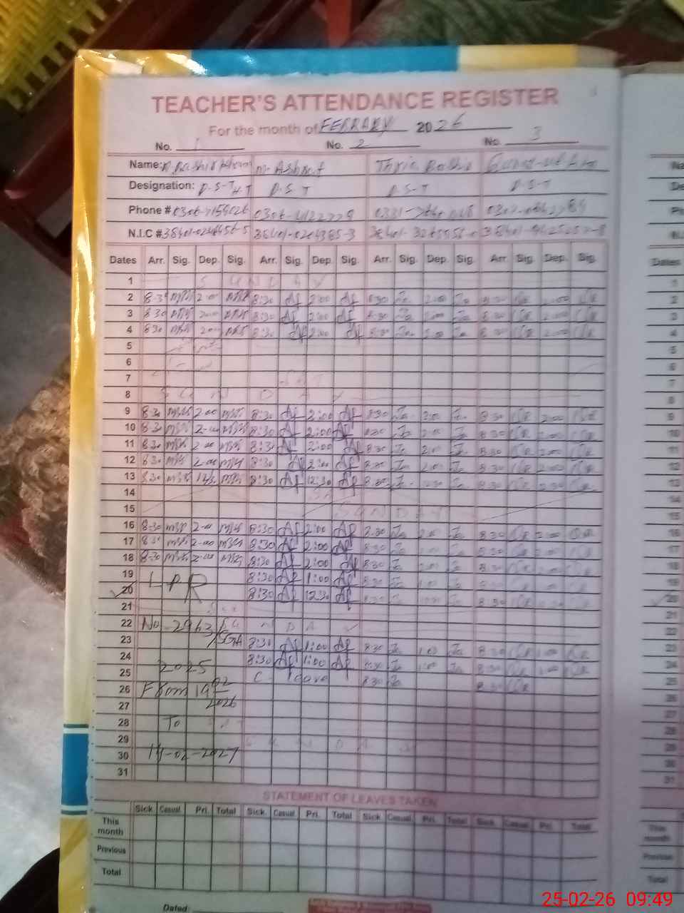 | CNIC | Full Name | Designation | R/C | Absence during last cal. month |