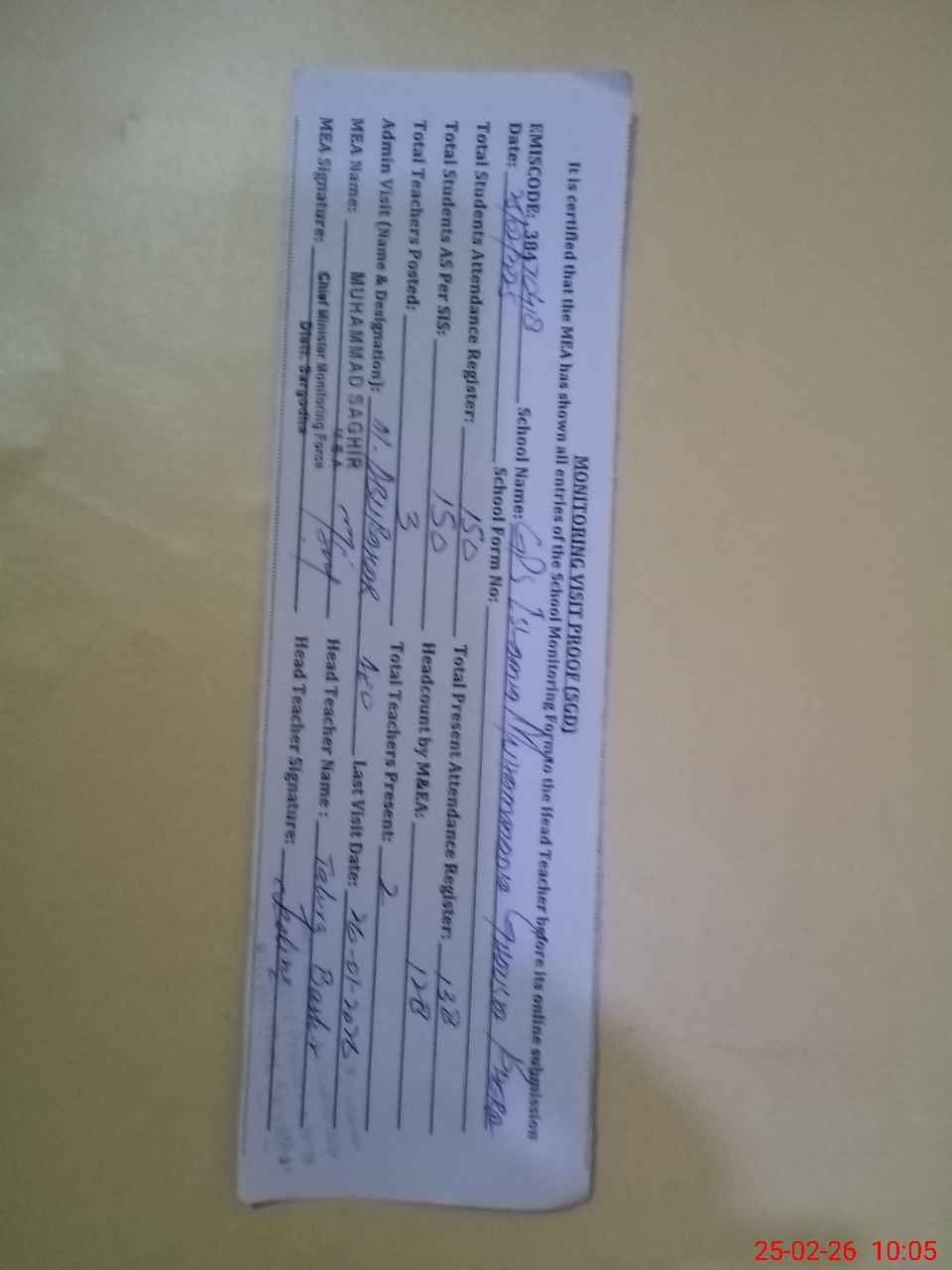 | Attendance Register | Head Teacher | MEA with School | Visit Proof |