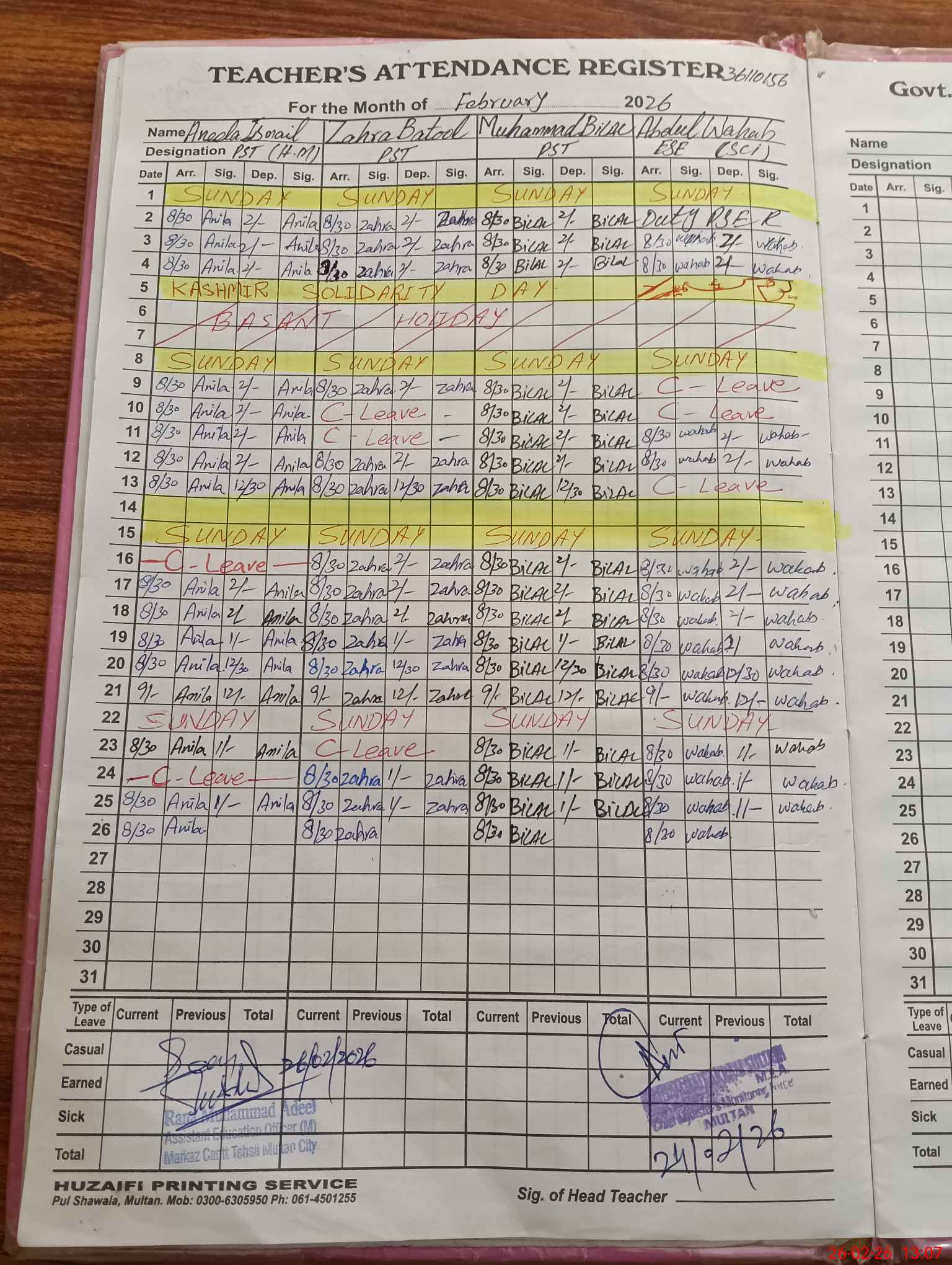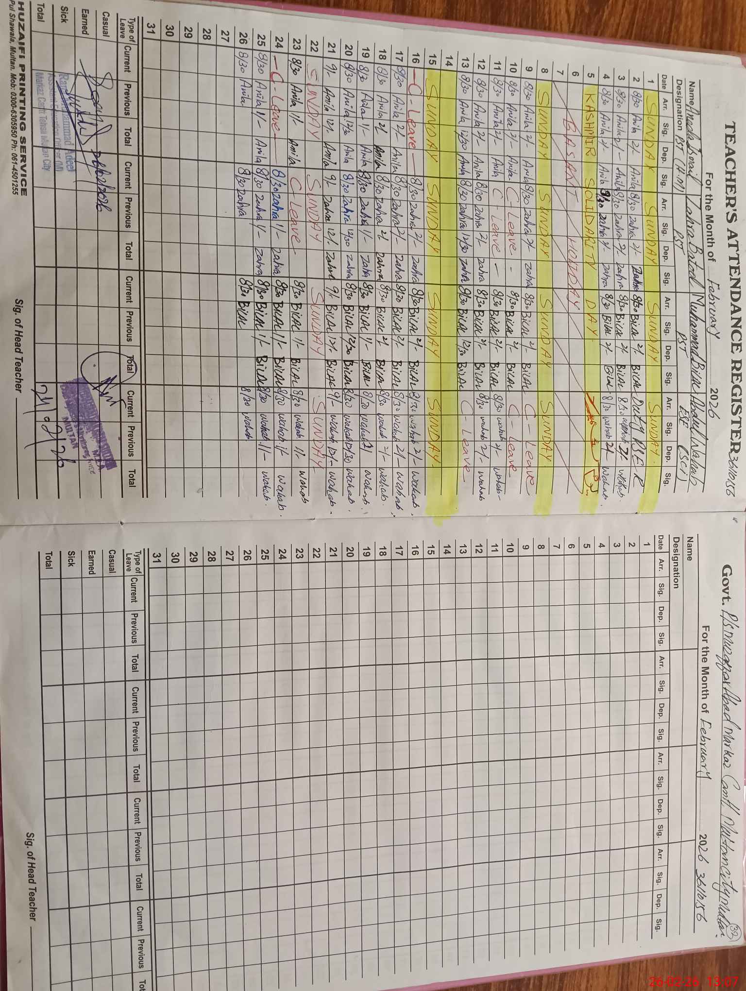 | CNIC | Full Name | Designation | R/C | Absence During Last Calender Month |