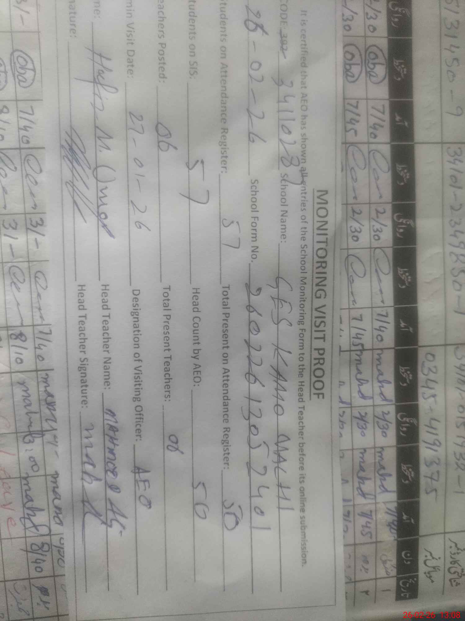 | Certified that this School was Inspected by the Undersigned MEA/DMO Today and the Information Stated Above is as Per Record. | |||||