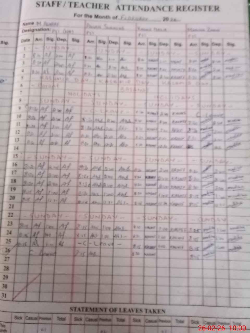 | Remarks (Use Separate Page if Required): PST MUHAMMAD ASHRAF IS ABSENT FROM SCHOOL NO LEAVE RECORD Verify 12/06 STUDENTS OF CLASS 01 in class 06 present | |||||