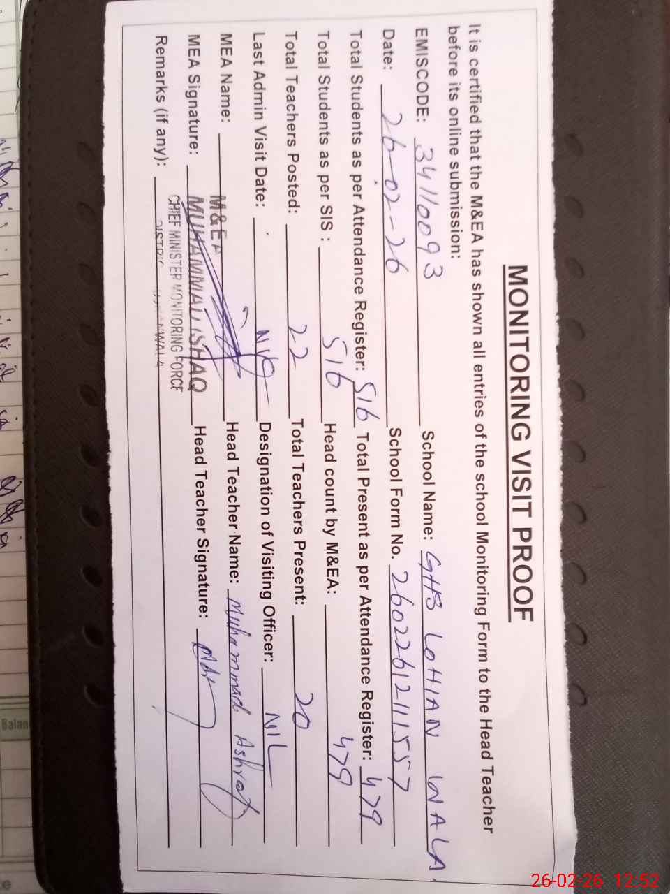 | EMIS Code: 34110093 | Name of School: GHS LOHIAN WALA | |||