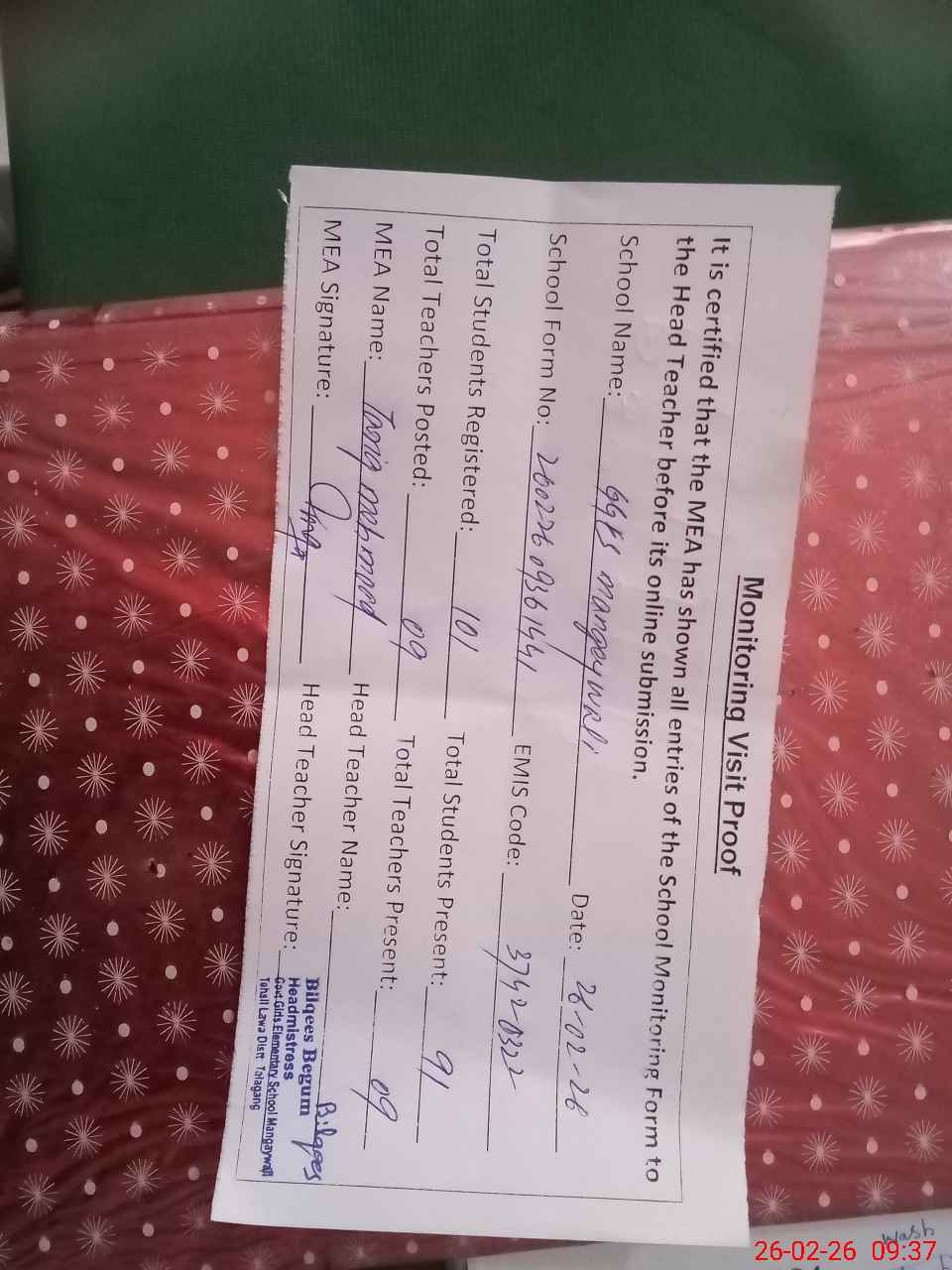 | Attendance Register | Head Teacher | MEA with School | Visit Proof |