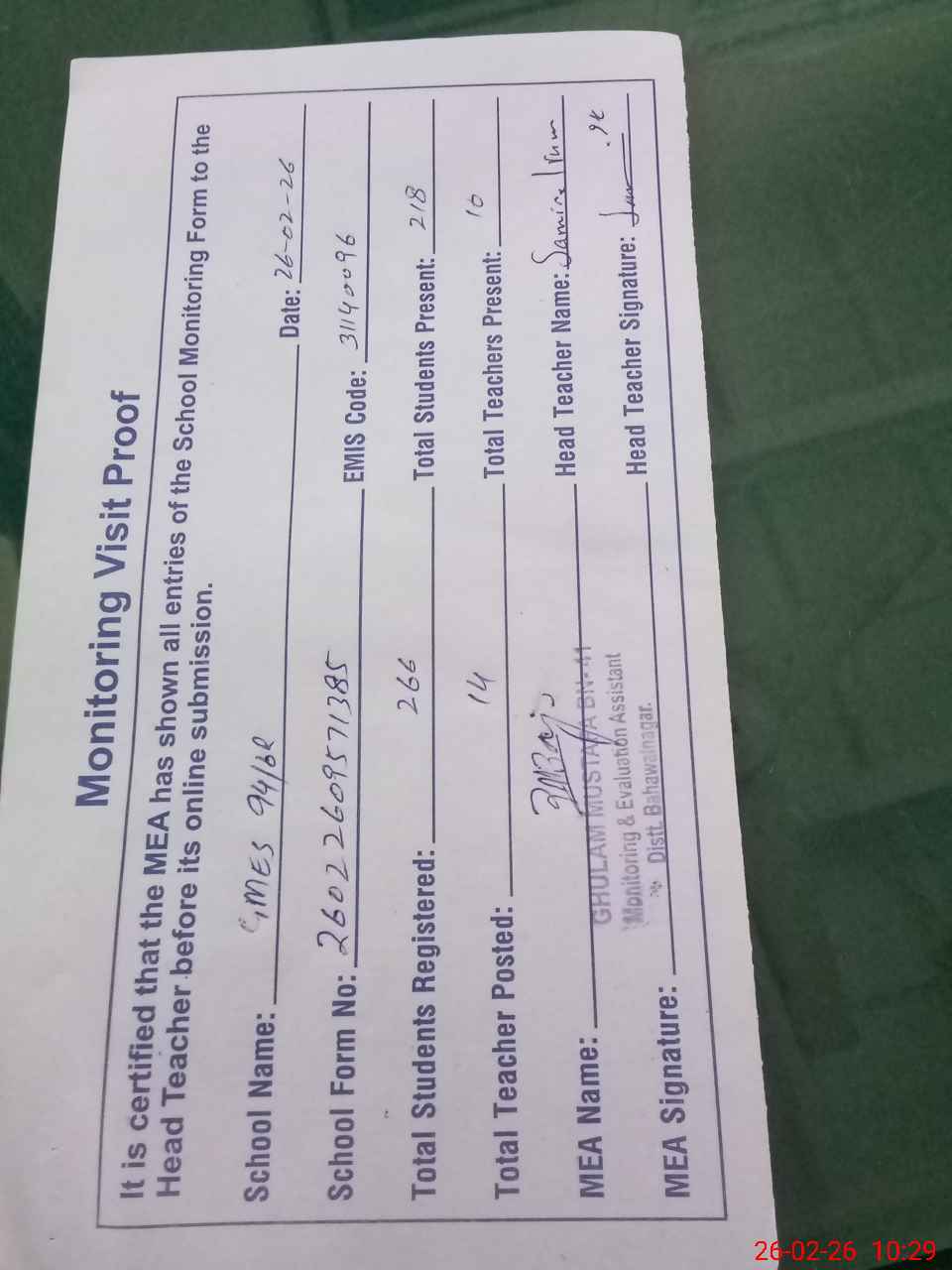 | Attendance Register | Head Teacher | MEA with School | Visit Proof |
