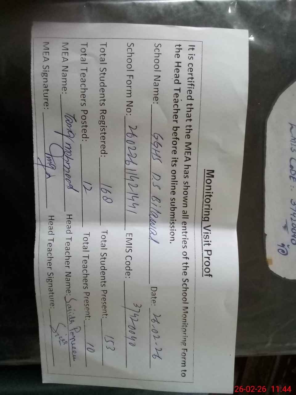 | Certified that this School was Inspected by the Undersigned MEA/DMO Today and the Information Stated Above is as Per Record. | |||||