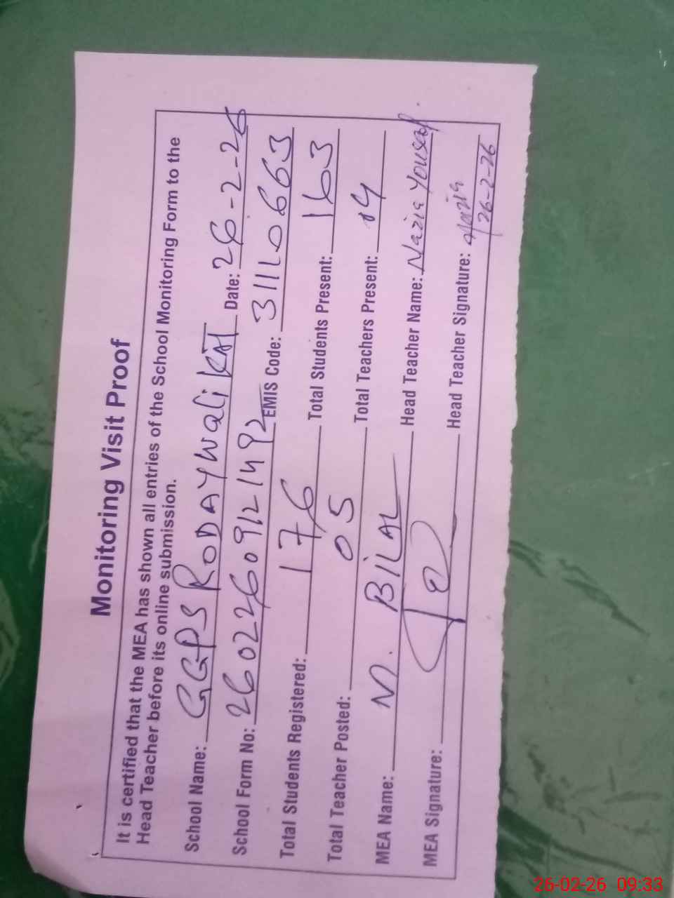 | Attendance Register | Head Teacher | MEA with School | Visit Proof |