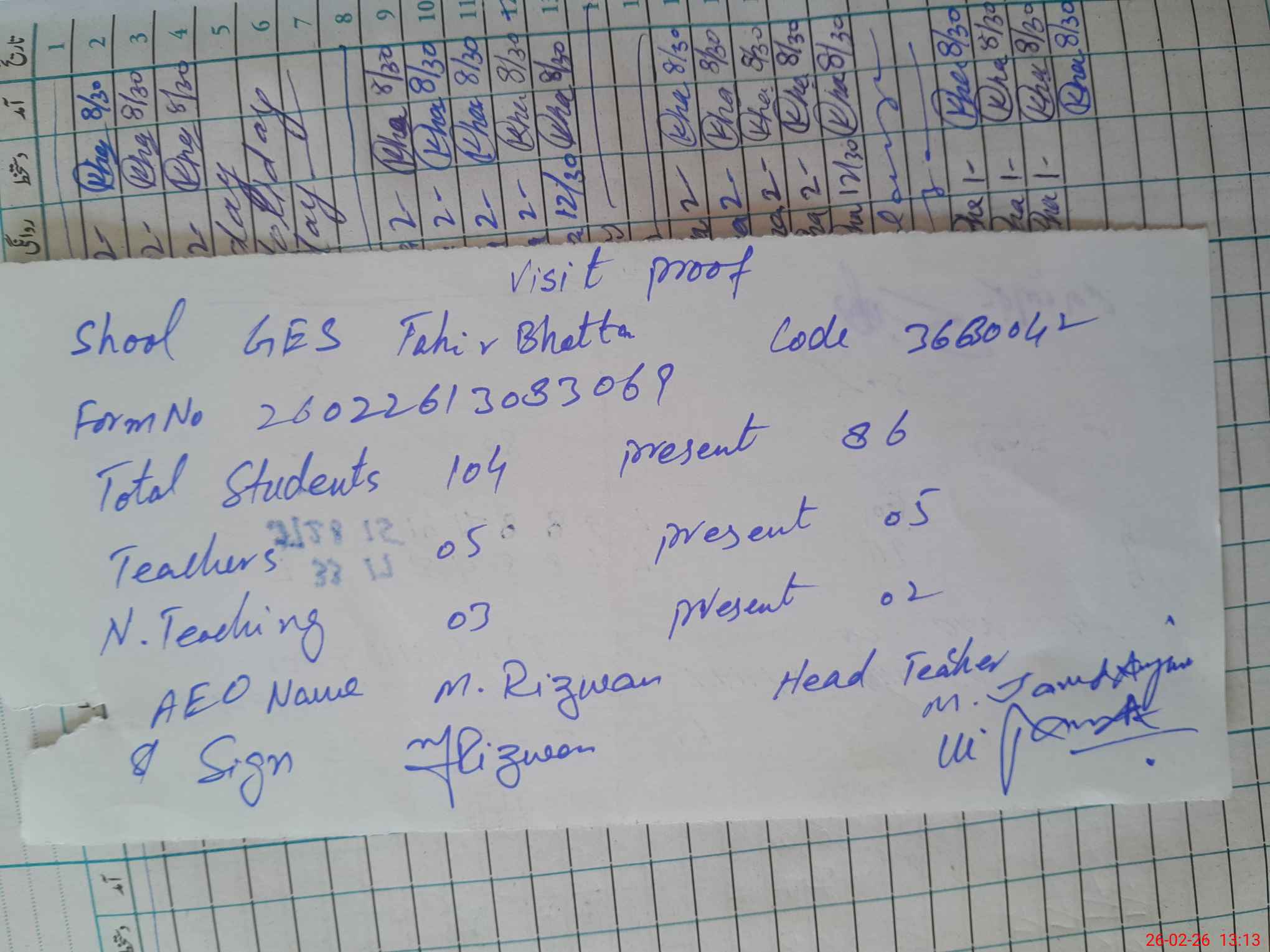 | Attendance Register | Head Teacher | MEA with School | Visit Proof |