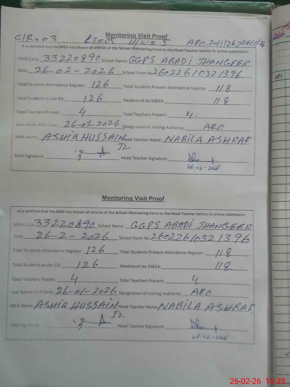 | EMIS Code: 33220890 | Name of School: GGPS ABADI JAHANGEER | |||