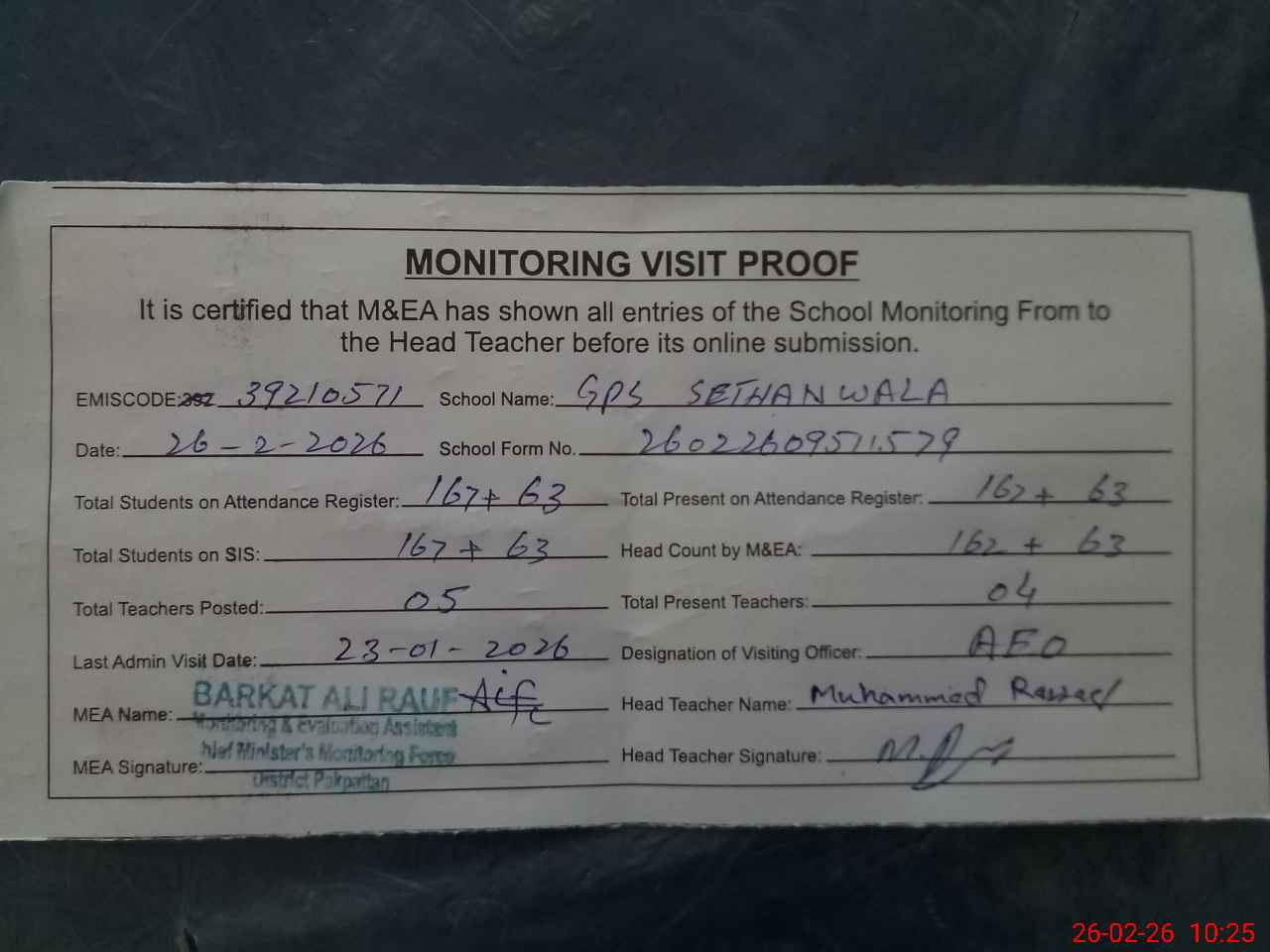 | EMIS Code: 39210571 | Name of School: GPS SETHAN WALA | |||
