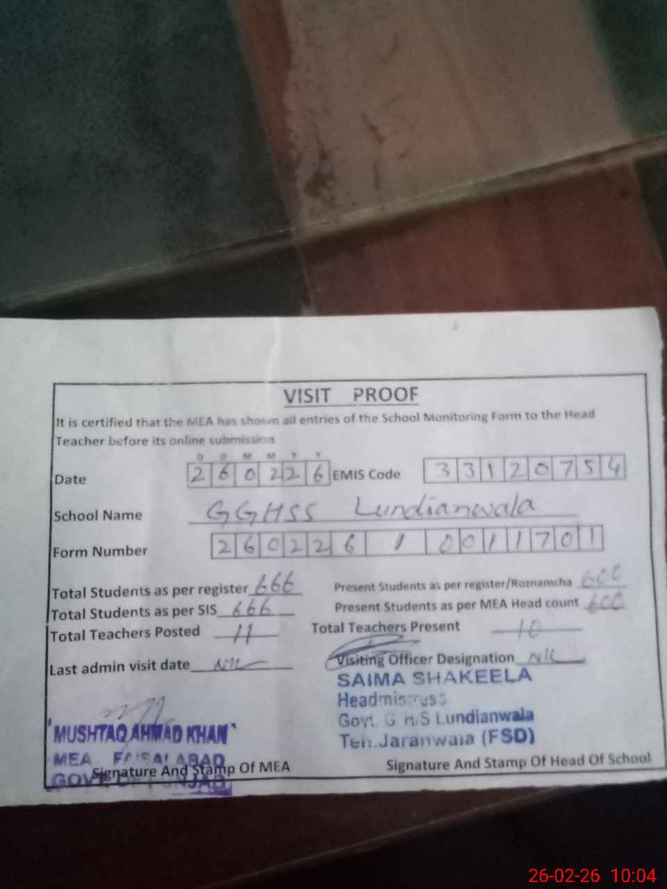 | Attendance Register | Head Teacher | MEA with School | Visit Proof |