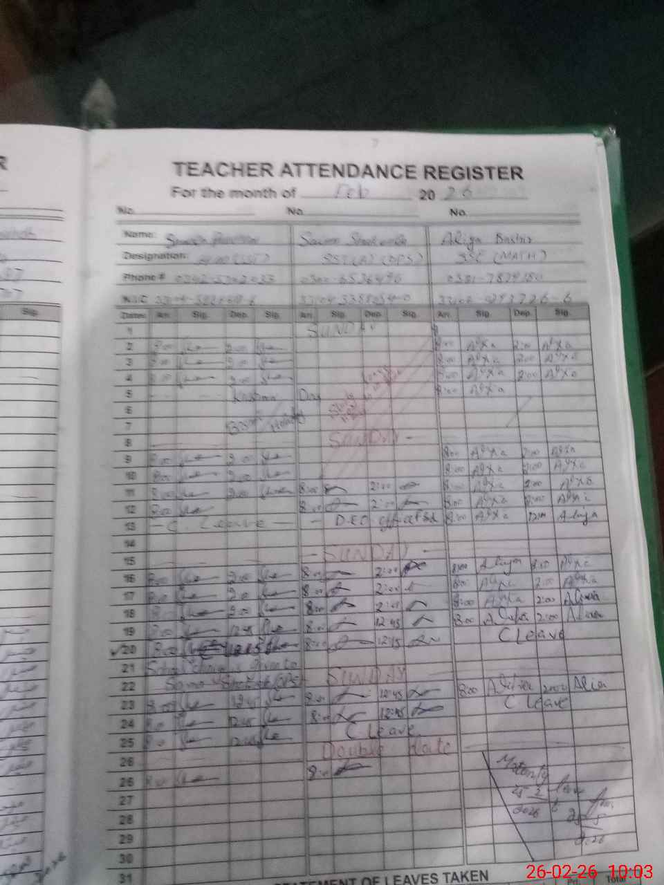 | CNIC | Full Name | Designation | R/C | Absence During Last Calender Month |