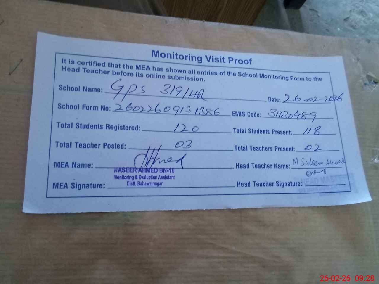 | EMIS Code: 31130489 | Name of School: GPS CHAK NO. 319/HR | |||
