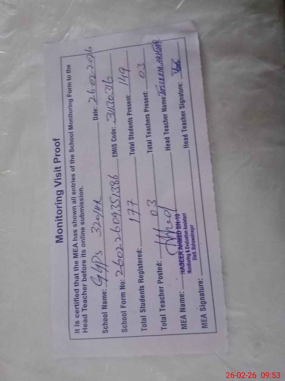 | Attendance Register | Head Teacher | MEA with School | Visit Proof |