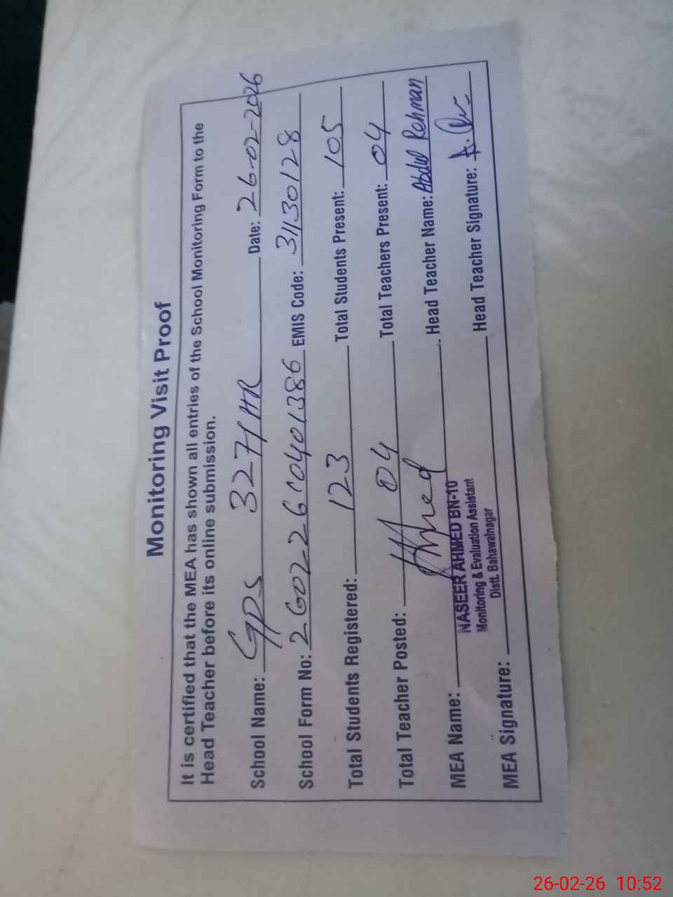 | EMIS Code: 31130128 | Name of School: GPS CHAK NO 327/HR | |||