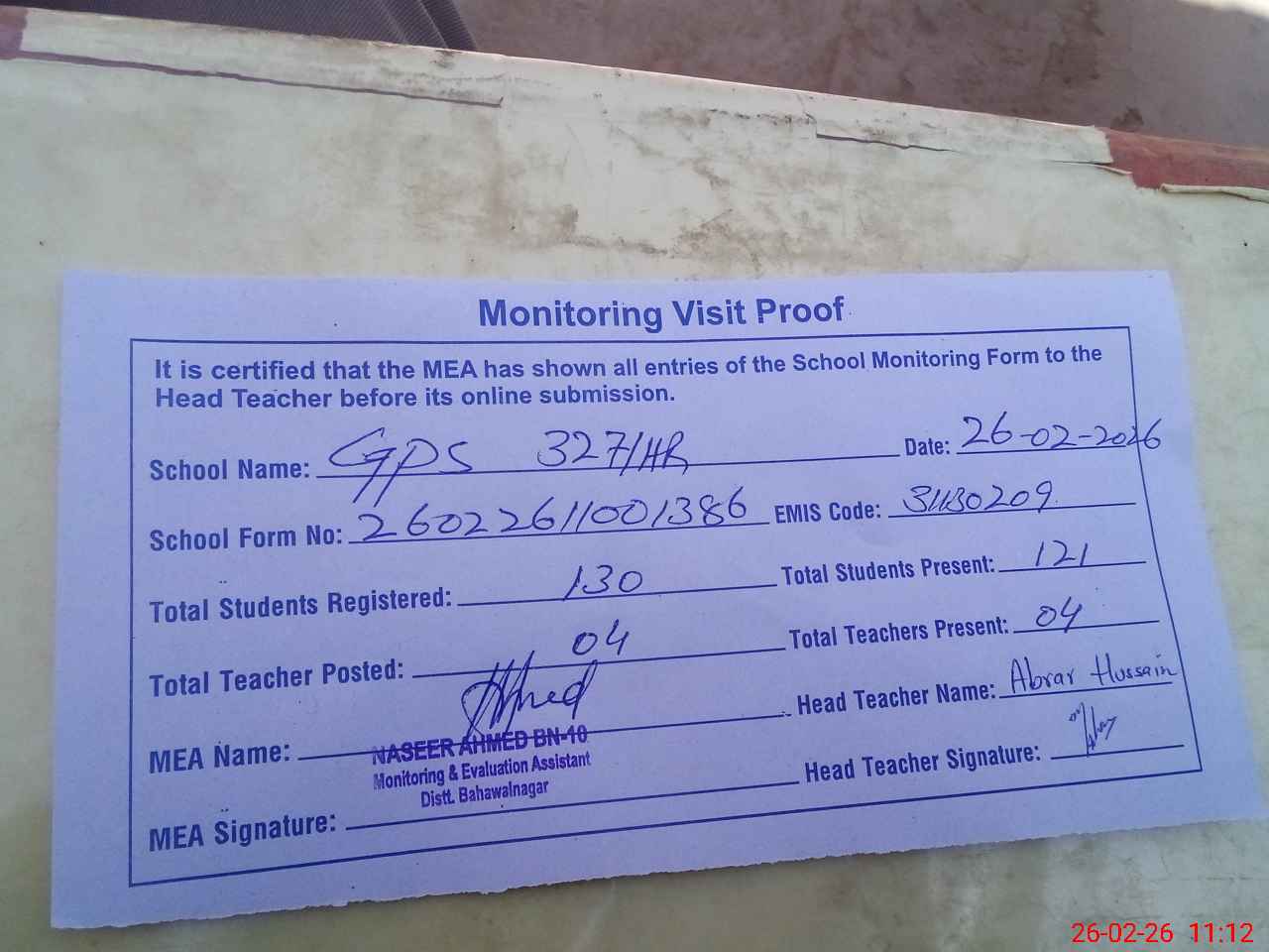 | EMIS Code: 31130209 | Name of School: GPS CHAK NO.327/HRL | |||