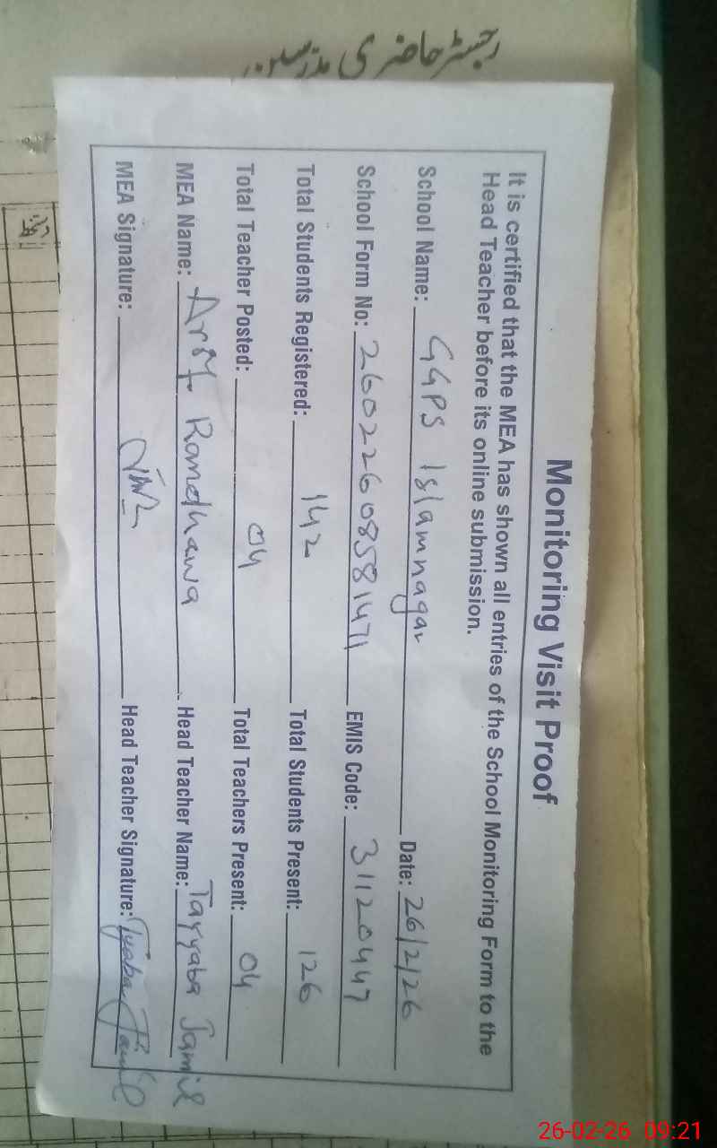 | EMIS Code: 31120447 | Name of School: GGPS ISLAM NAGAR | |||