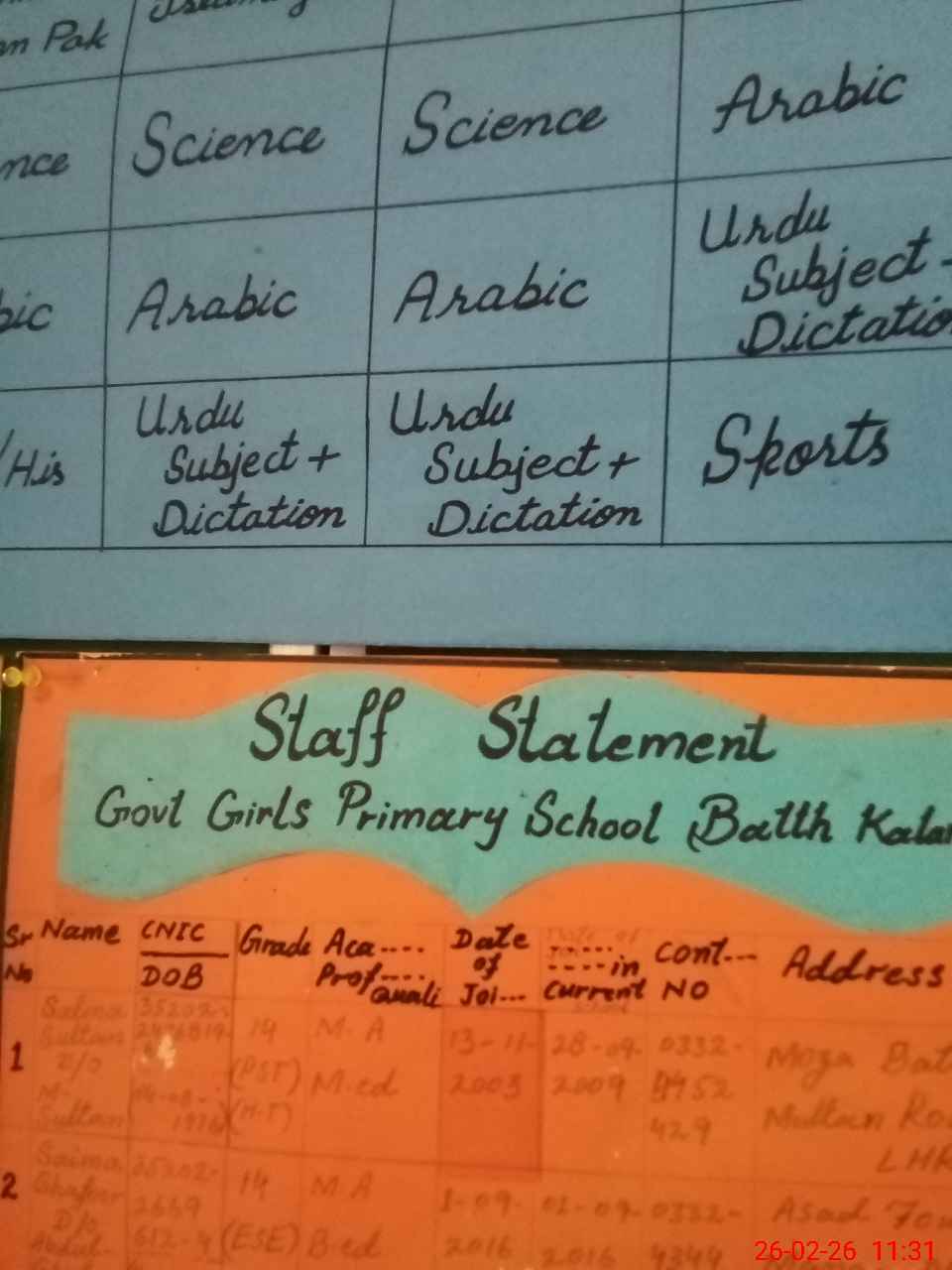 | EMIS Code: 35220429 | Name of School: GGPS BATH KALAN MULTAN ROAD | |||
