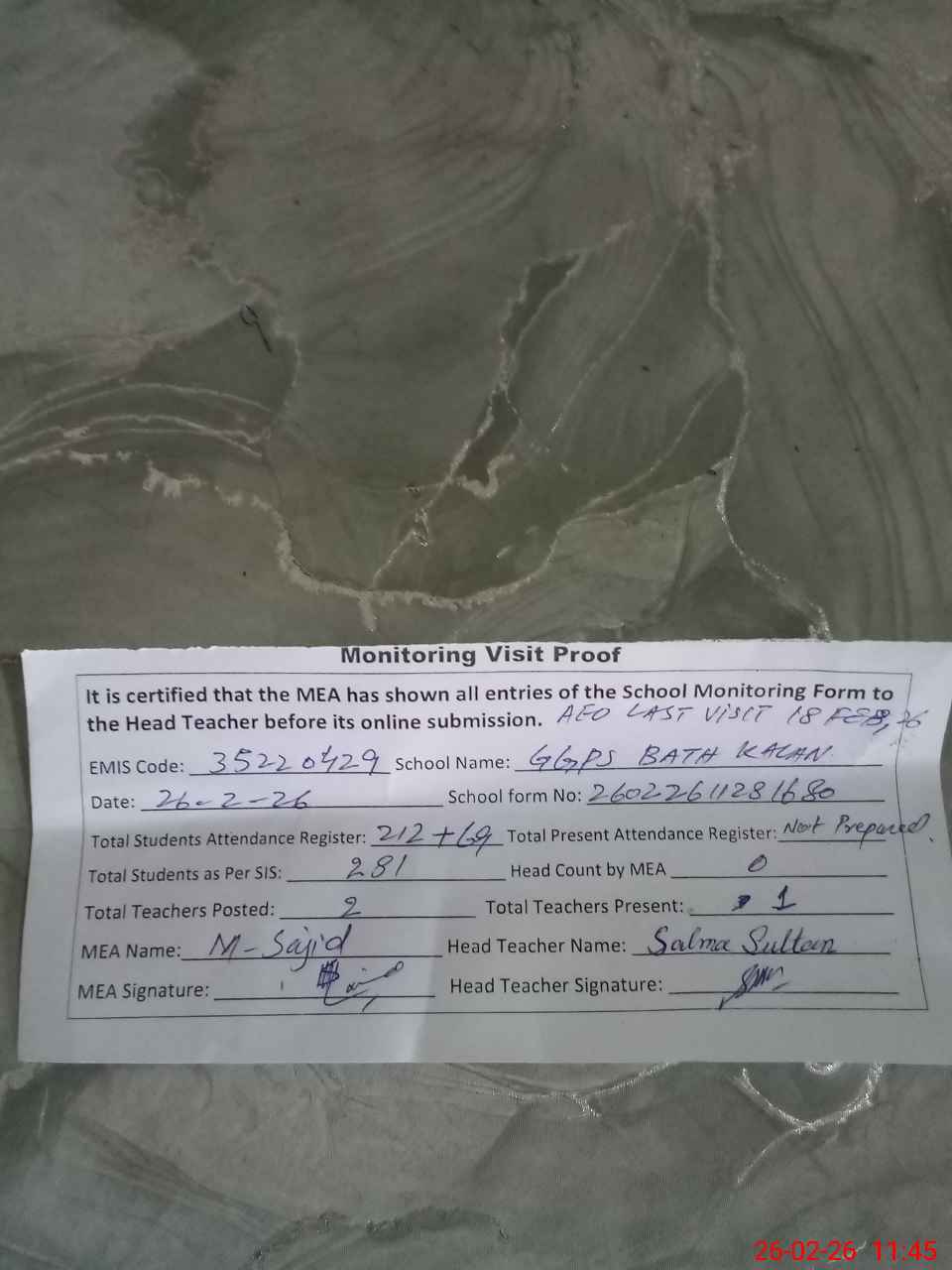 | Attendance Register | Head Teacher | MEA with School | Visit Proof |