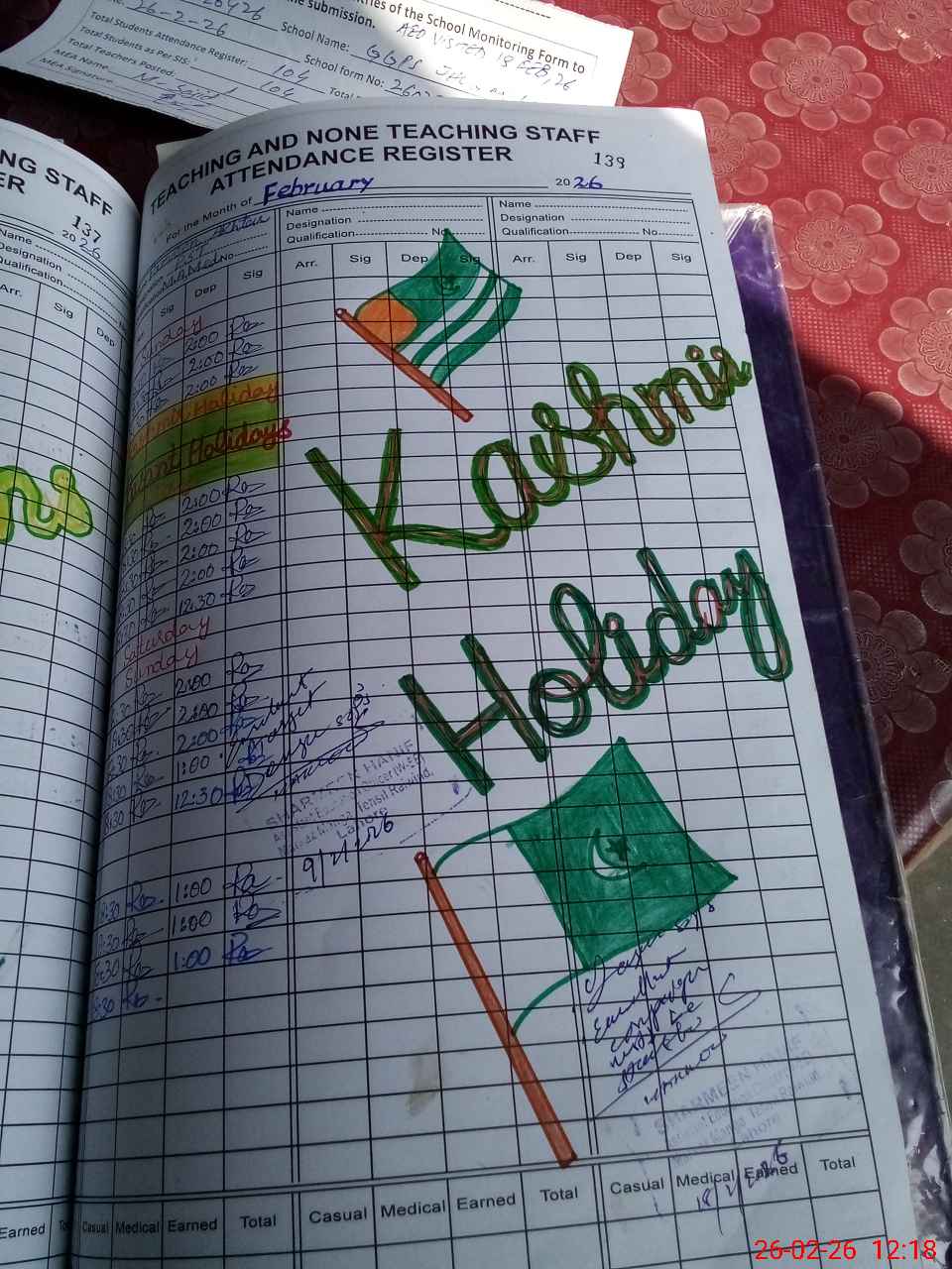 | Remarks (Use Separate Page if Required): Present students percentage is 55 percent Low attendance is because of an Urs in nearby village 35220246 | |||||