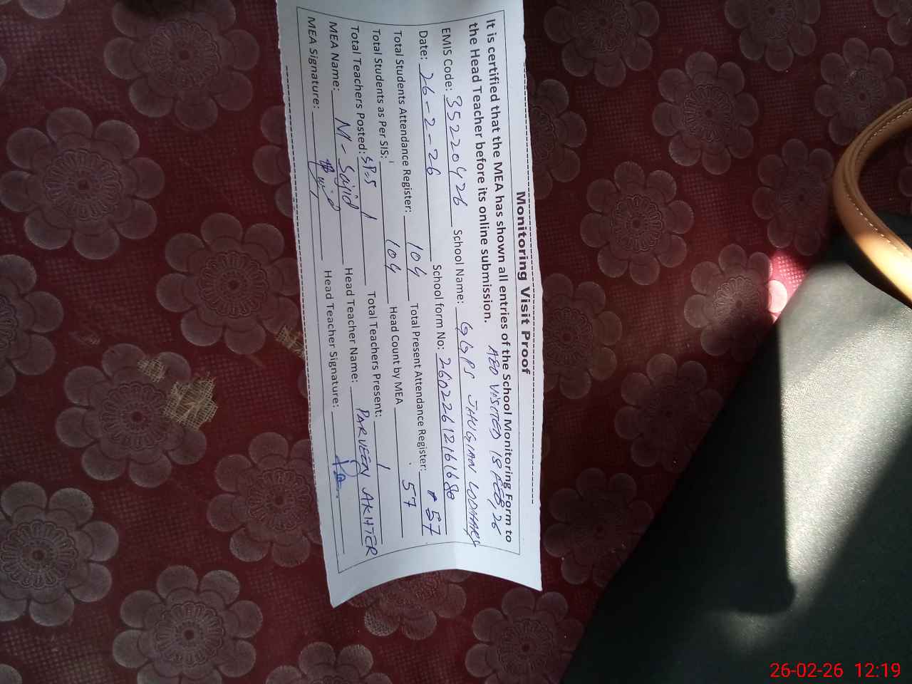 | Attendance Register | Head Teacher | MEA with School | Visit Proof |