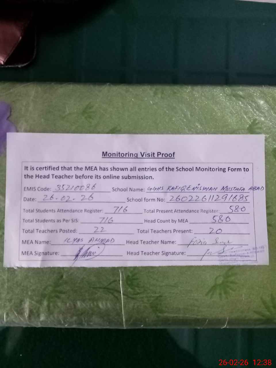 | Attendance Register | Head Teacher | MEA with School | Visit Proof |