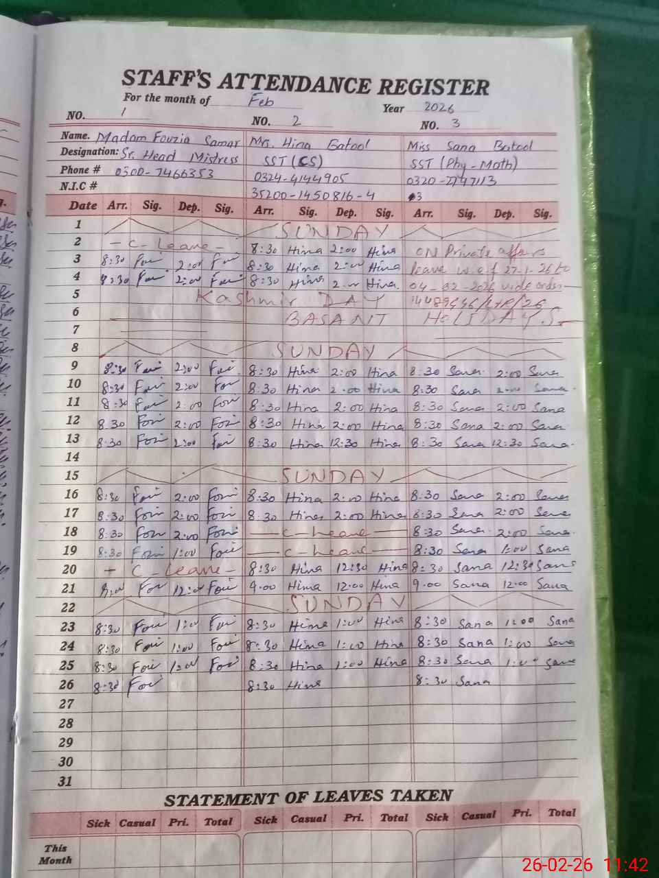 | CNIC | Full Name | Designation | R/C | Absence During Last Calender Month |