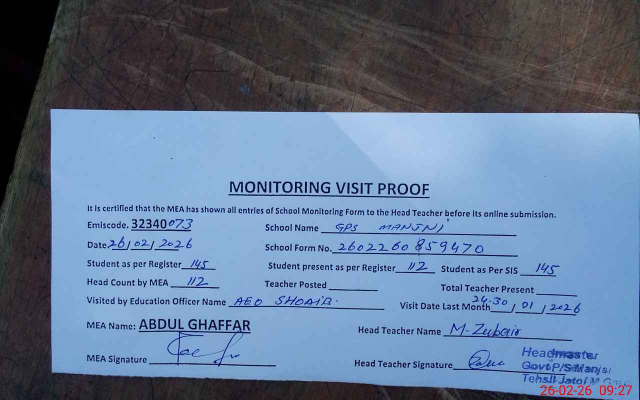 | Monitoring Date: 26-02-2026 | Start Time: 26-02-2026 08:59 AM | End Time: 26-02-2026 09:34 AM | Name of MEA: Ab**** Gh**** | |