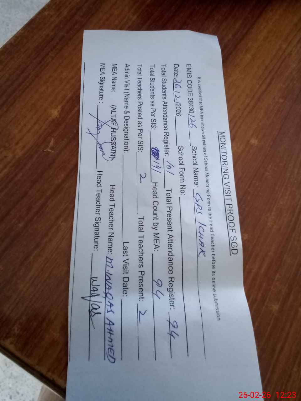 | Attendance Register | Head Teacher | MEA with School | Visit Proof |
